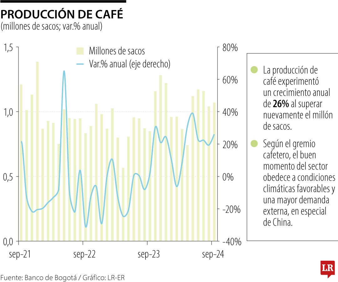 La producción de café tuvo crecimiento anual de 26%, ya que, superó el millón de sacos. El gremio cafetero reveló que el sector está en un buen momento y esto obedece a condiciones climáticas favorables y una creciente demanda externa, en especial de China, argumentó el Banco.
