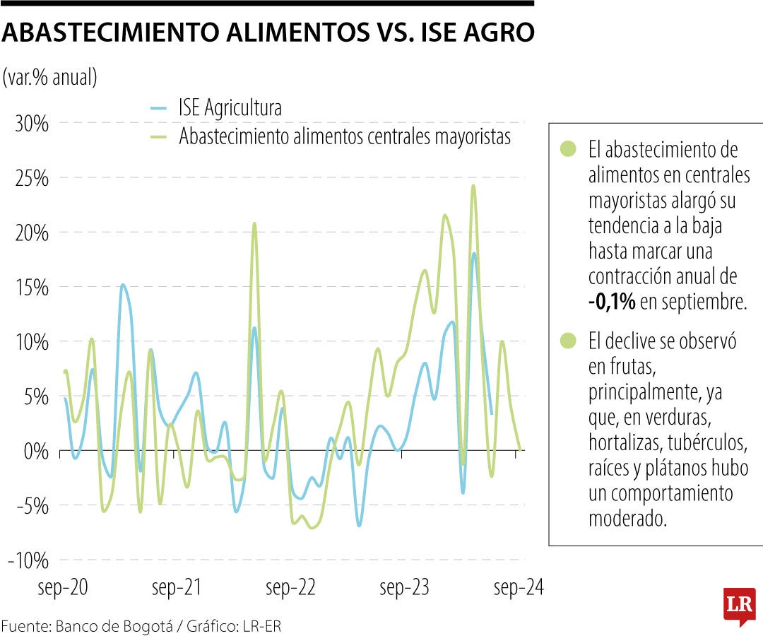 El abastecimiento de alimentos en centrales mayoristas tuvo una tendencia a la baja hasta llegar una contracción anual de 0,1% en septiembre de 2024. La baja se presentó en frutas, pero en verduras como hortalizas, tubérculos, raíces y plátanos la contracción fue moderada.