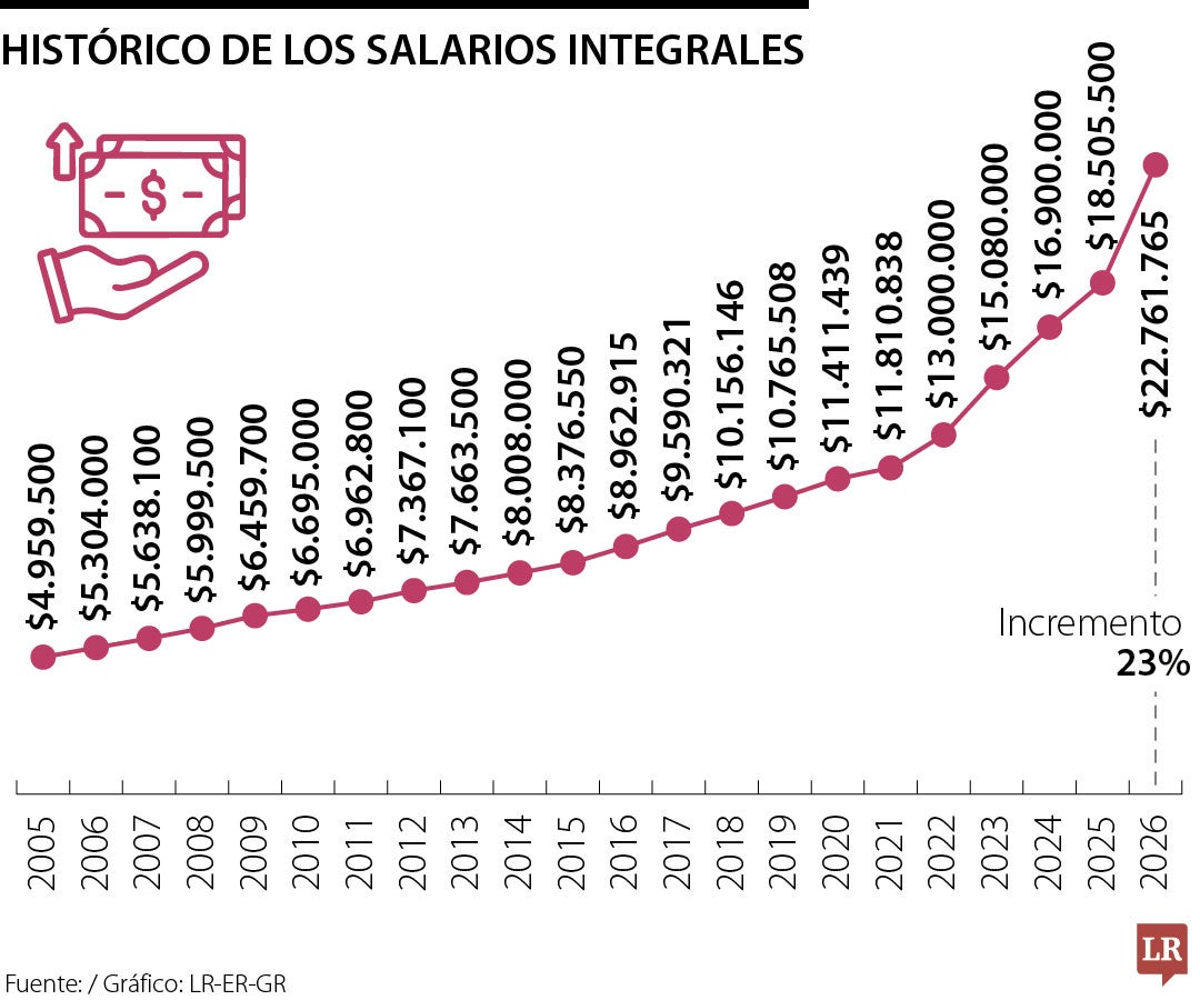 Con un salario mínimo fijado para 2026 en $1,75 millones, el salario integral, que equivale a 13 veces este rubro, quedó en $22,76 millones