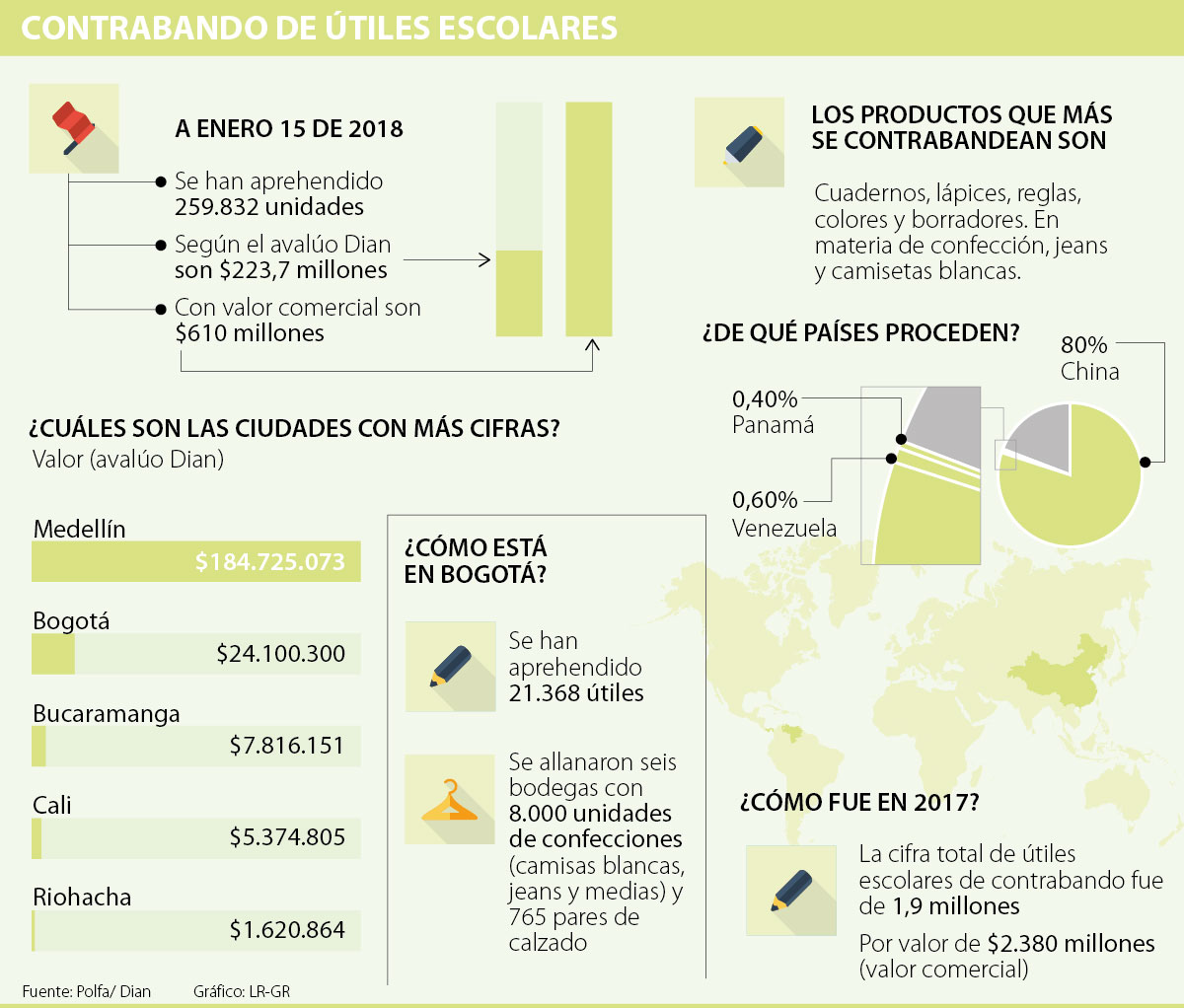 ¿Qué cifras dejó el año pasado? De acuerdo con los datos de la Dian y Polfa, en 2017 fueron aprehendidas 1,9 millones de unidades de útiles escolares por valor (comercial) de $2.380 millones provenientes en 70% desde China.