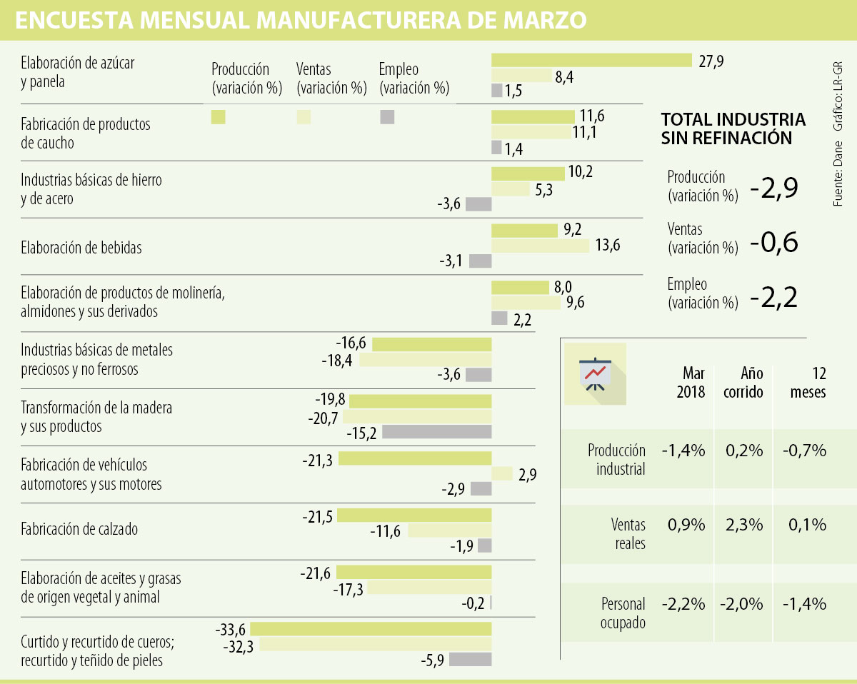 El Departamento Administrativo Nacional de Estadística (Dane) presentó los resultados de la Encuesta Mensual Manufacturera (EMM) de marzo en la que reveló que para ese mes, la producción de las 39 actividades industriales cayó en 1,4%, al igual que el personal ocupado, que disminuyó en 2,2%, mientras que las ventas reales aumentaron 0,9%.