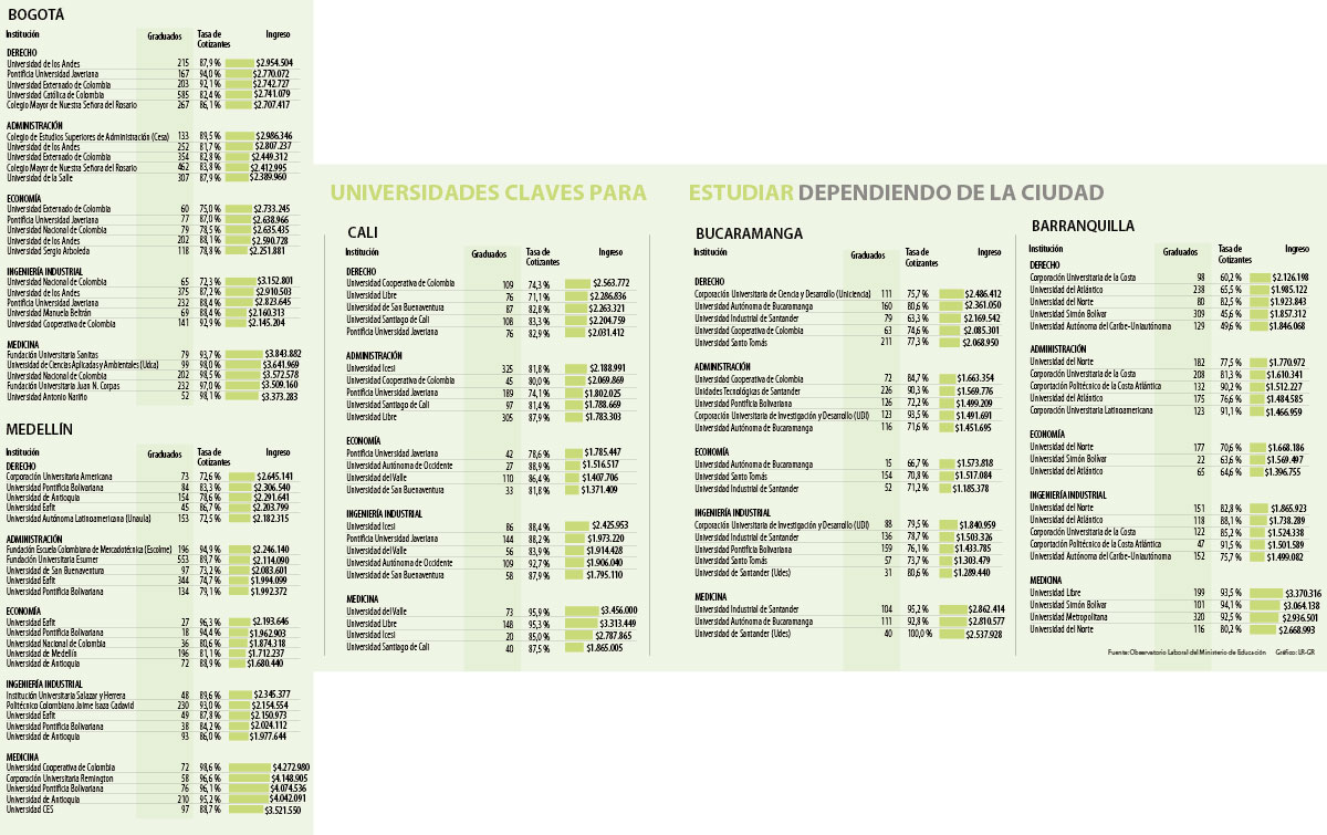 Si bien no hay fórmula mágica para saber cuál será el sueldo al salir de la universidad, una herramienta del Ministerio de Educación, el Observatorio Laboral para la Educación (OLE), permite conocer el salario de los egresados de las universidades. Le mostramos cuáles son las universidades, por ciudades y carreras, cuyos graduados de pregrado tienen los mayores ingresos.