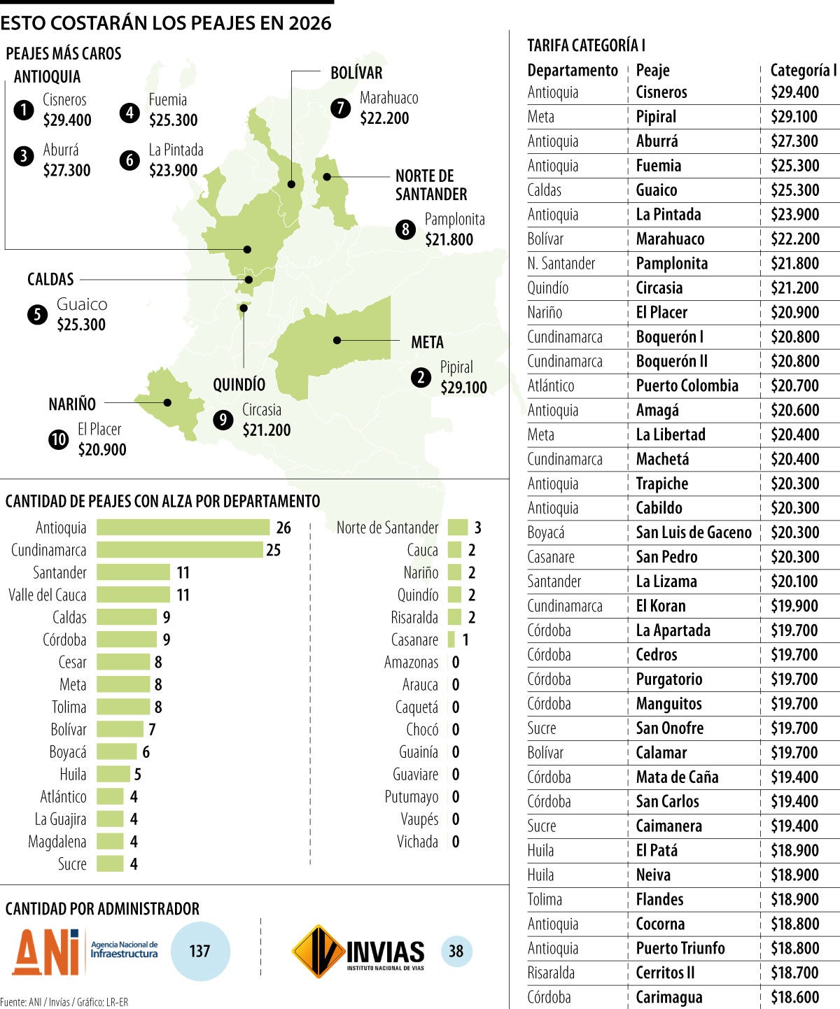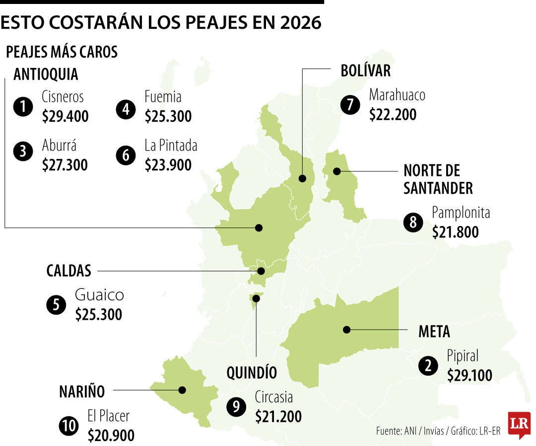 Las tres estaciones de cobro que quedaron con los precios más altos para la Categoría I (Automóviles, camperos, camionetas y microbuses con ejes de llanta sencilla), fueron Cisneros, ubicada en Antioquia ($29.400); Pipiral, en Meta ($29.100); y Aburrá, también en Antioquia, ($27.300).