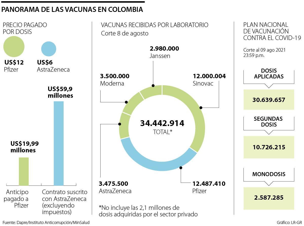 Según la información publicada, Colombia habría pagado US$12 por cada dosis de la vacuna a Pfizer, mientras el monto por cada una de las de AstraZeneca habría ascendido a US$6. Cabe recordar que los fármacos de estas compañías requieren de la aplicación de dosis para completar el esquema de inmunización.