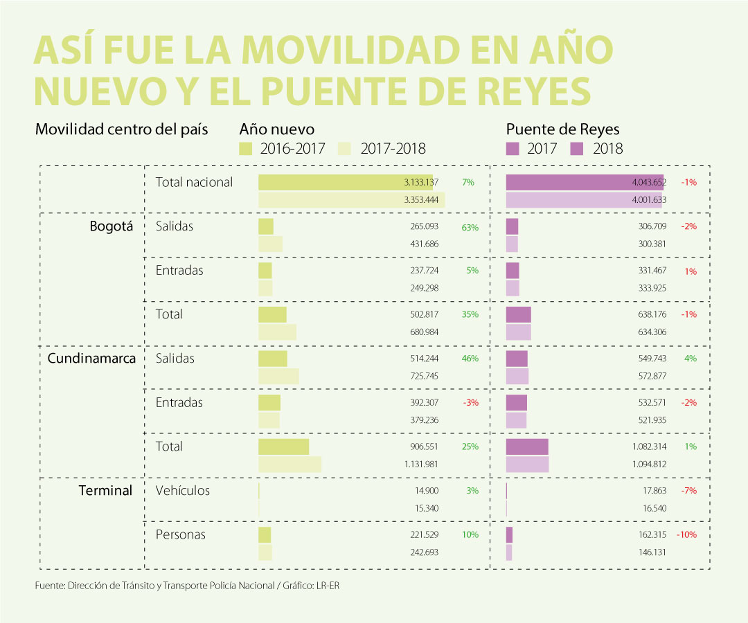 En el centro del país, Bogotá vio un incremento de 35% en la movilización de vehículos durante el puente de año nuevo. En la misma fecha del año pasado salieron y entraron 502.817 vehículos mientras que en 2018 subió a 680.984. De estos, 431.686 salieron de la ciudad, lo que significó un incremento de 63% en comparación con el año anterior (265.093).