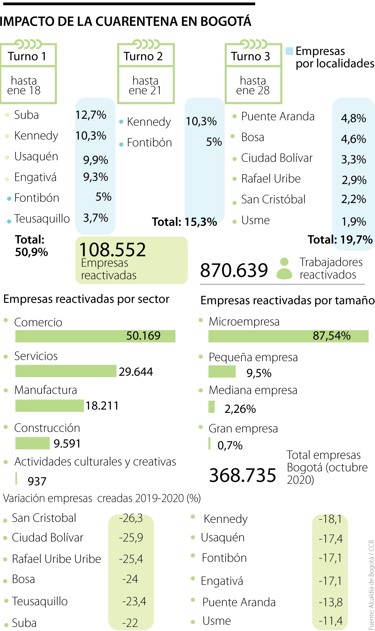 De estas, las primeras cuatro terminan su turno de cuarentena el lunes 18 a las 4:00 a.m., al tiempo que finaliza el toque de queda total de la ciudad. En cambio, en Kennedy y Fontibón, que en conjunto representan 15,3% del tejido empresarial capitalino, se levantará la restricción el próximo jueves 21 de enero a las 11:59 p.m.