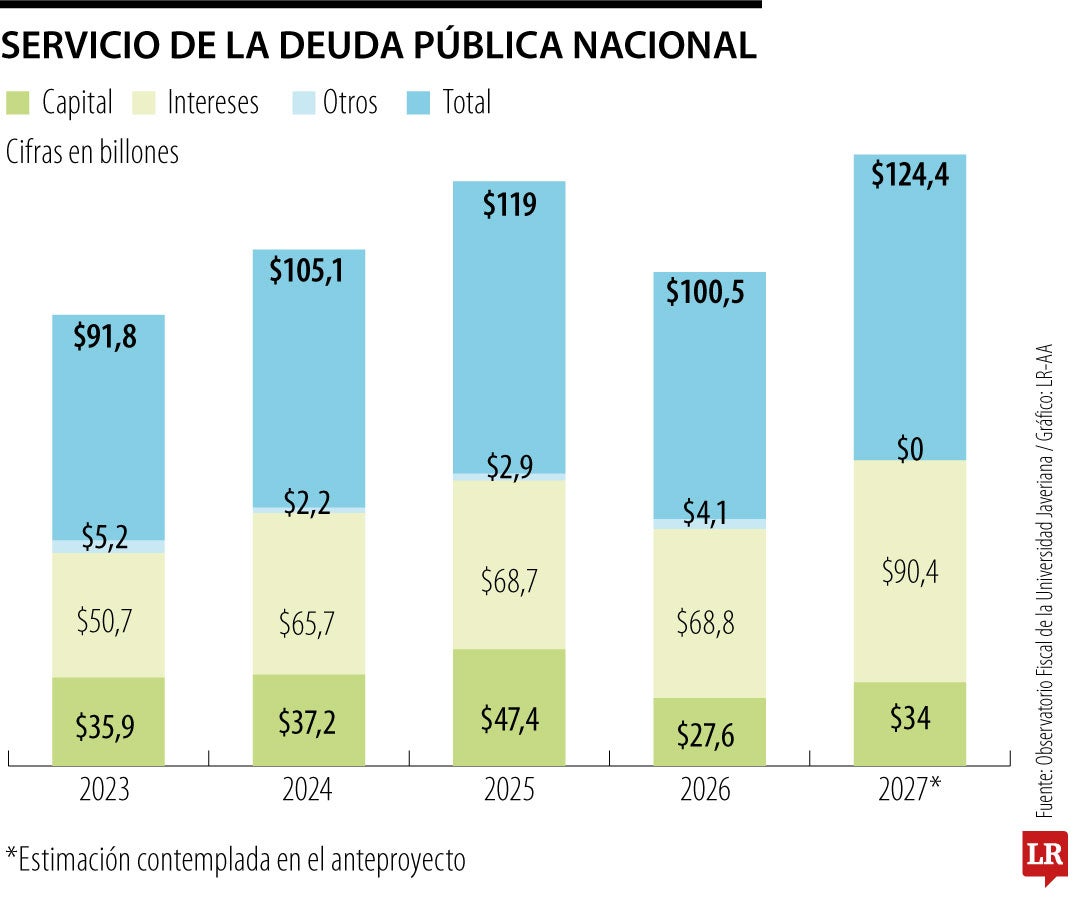 Si bien el pago de intereses no ha bajado de $39 billones desde 2019, el salto que daría en 2027 frente a 2026 es el salto más alto en el plazo de un año.