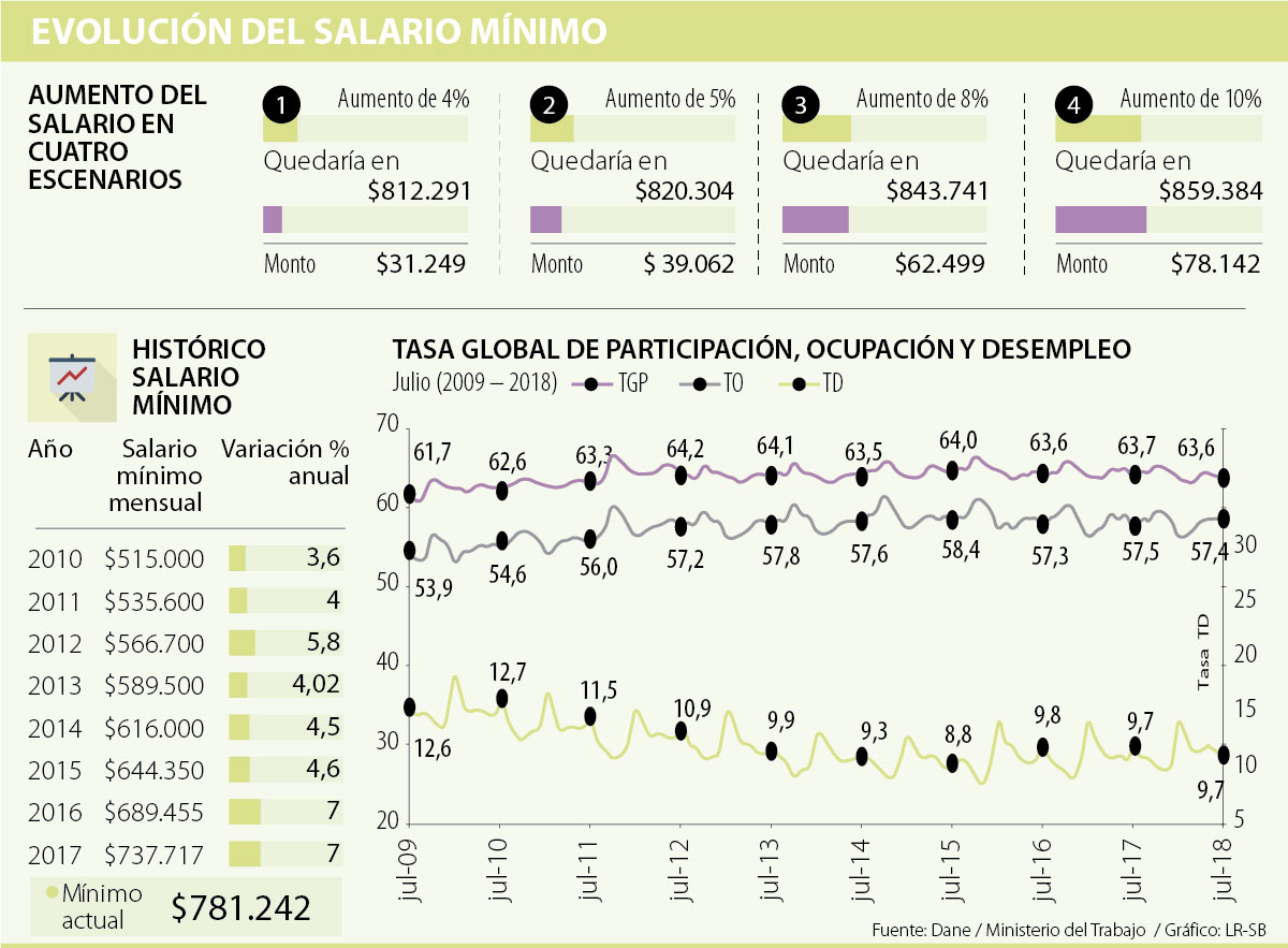 De darse ese salto en el cálculo de la productividad, y teniendo en cuenta que la idea del proyecto del Centro Democrático es que el incremento sea “cuantioso”, un tercer escenario optimista podría incluir un aumento de 8%, con lo que el mínimo de 2019 llegaría hasta los $843.741, pues el alza sería de $62.499. Ahora, si el incremento lograra ser cercano a las peticiones de las centrales obreras y creciera el salario 10% (usualmente de 12%), el incremento sería de $78.142, con lo cual, el mínimo se ubicaría en $859.384.