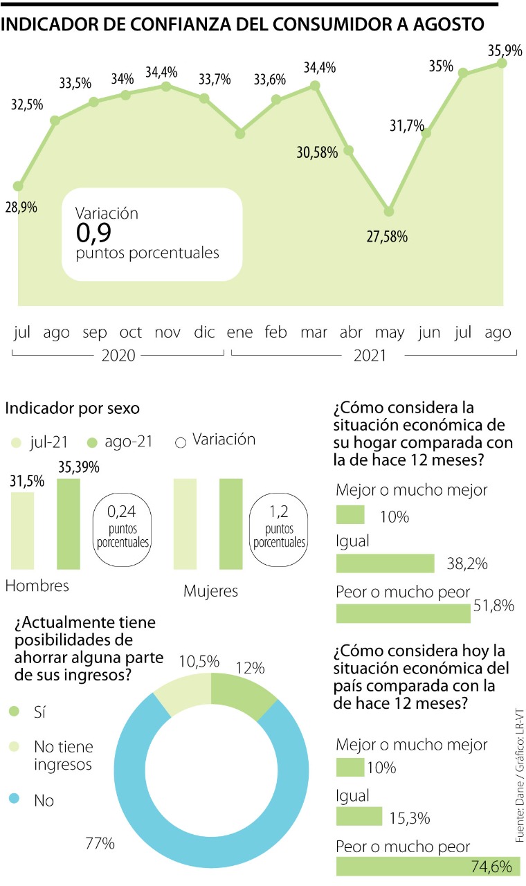 El indicador fue de 35,9% en agosto, el mayor nivel desde julio de 2020. Bogotá concentra a los consumidores con la menor confianza