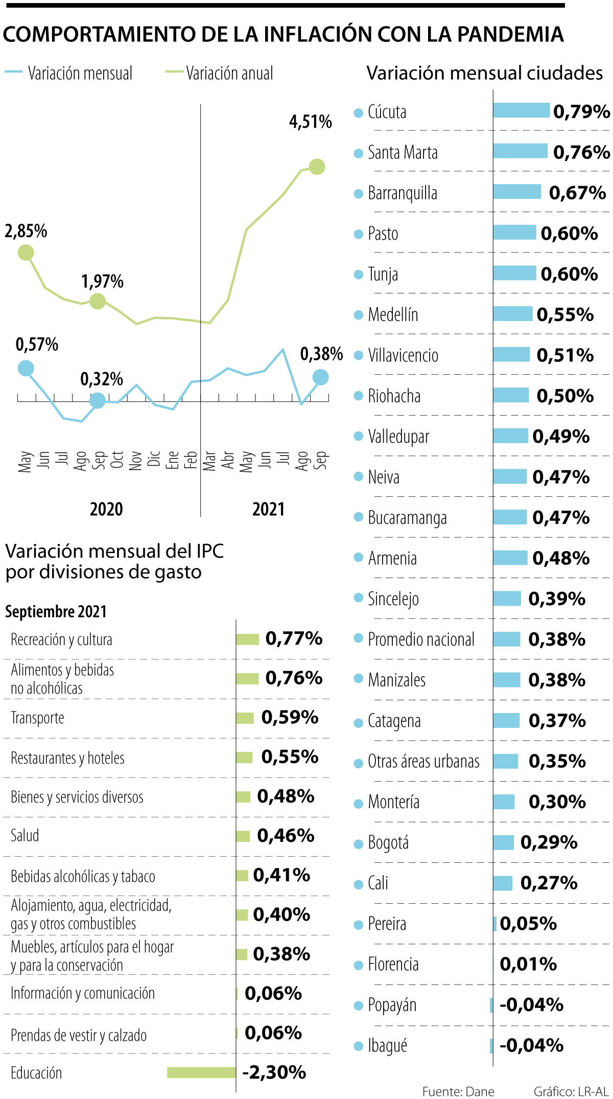 El Dane actualizó la variación del Índice de Precios al Consumidor (IPC) y anunció que para septiembre la cifra llegó a 0,38%; en el año corrido (enero-septiembre) el dato llegó a 4,33% y la anualizada cerró en 4,51%.