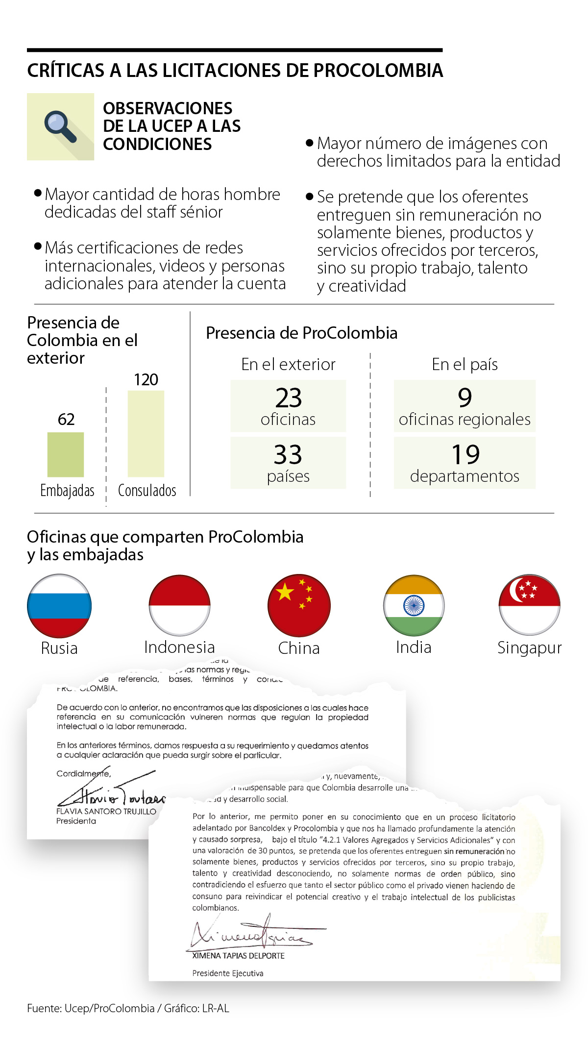 “El mencionado documento señala que ProColombia calificará la propuesta de acuerdo con ciertos criterios objetivos, entre los cuales se encuentra el que dentro de una propuesta (fee mensual) pueda incluir la mayor cantidad de productos o servicios entre otros, horas hombre, banco de imágenes y música, red de aliados, entre otros. Lo que debe entenderse es que todo lo anterior se remunera con el fee mensual”, escribió la presidenta. Además, en la carta, agregó que “no existe vulneración alguna, en el texto incluida en los términos de referencia, teniendo en cuenta que el documento en cita es de público conocimiento, por lo que los interesados pueden consultarlos”.
