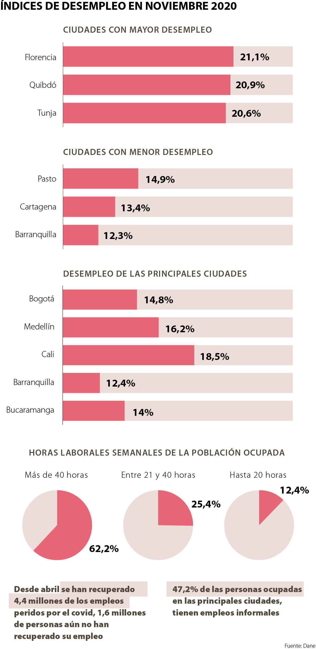 Florencia con 21,1%, Quibdó con 20,9% y Tunja con 20,6%, son las ciudades con mayor desempleo, siendo Tunja la ciudad donde este indicador creció más, 8,6 puntos porcentuales en comparación con el mismo periodo del año inmediatamente anterior.