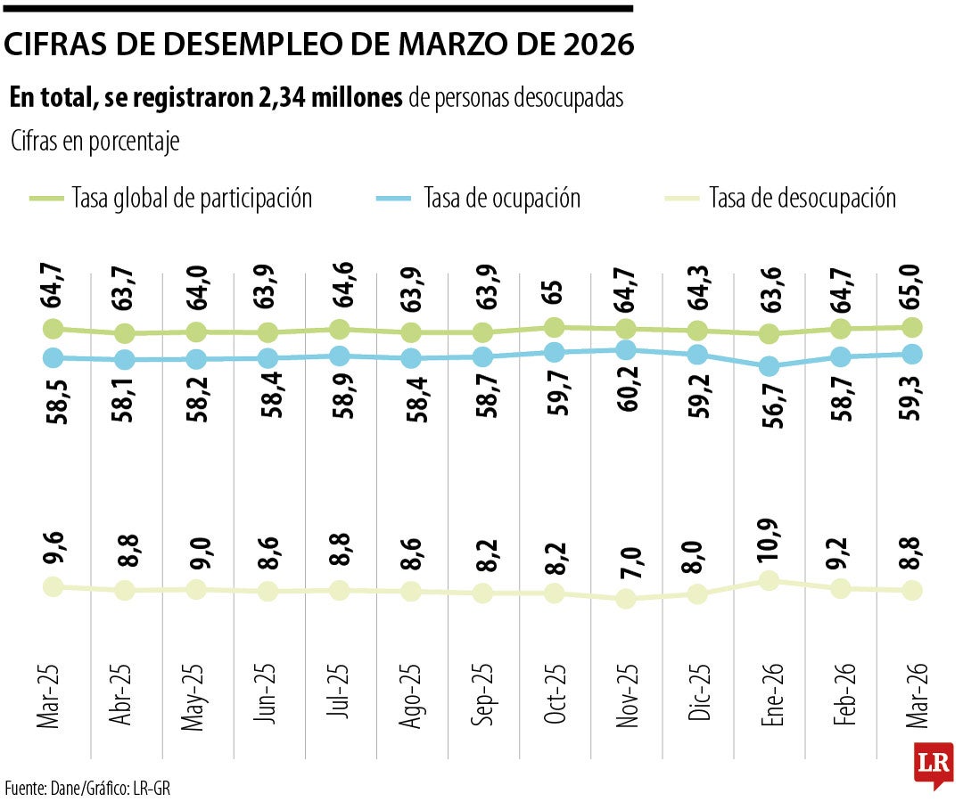 El Dane presentará este viernes las cifras de mercado laboral correspondientes al primer trimestre de 2026. En febrero la tasa fue de 9,1%, la más baja para un febrero desde 2001.