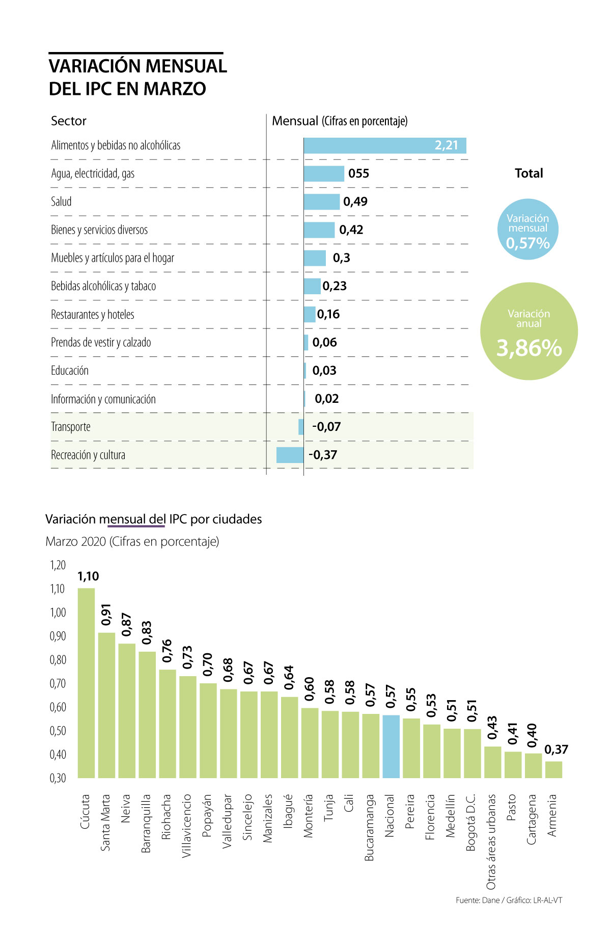 El Departamento Administrativo Nacional de Estadística (Dane) reportó que el alza del índice de Precios del Consumidor (IPC) en marzo de 2020 fue de 0,57%, lo que se tradujo en una cifra anual de 3,86%.