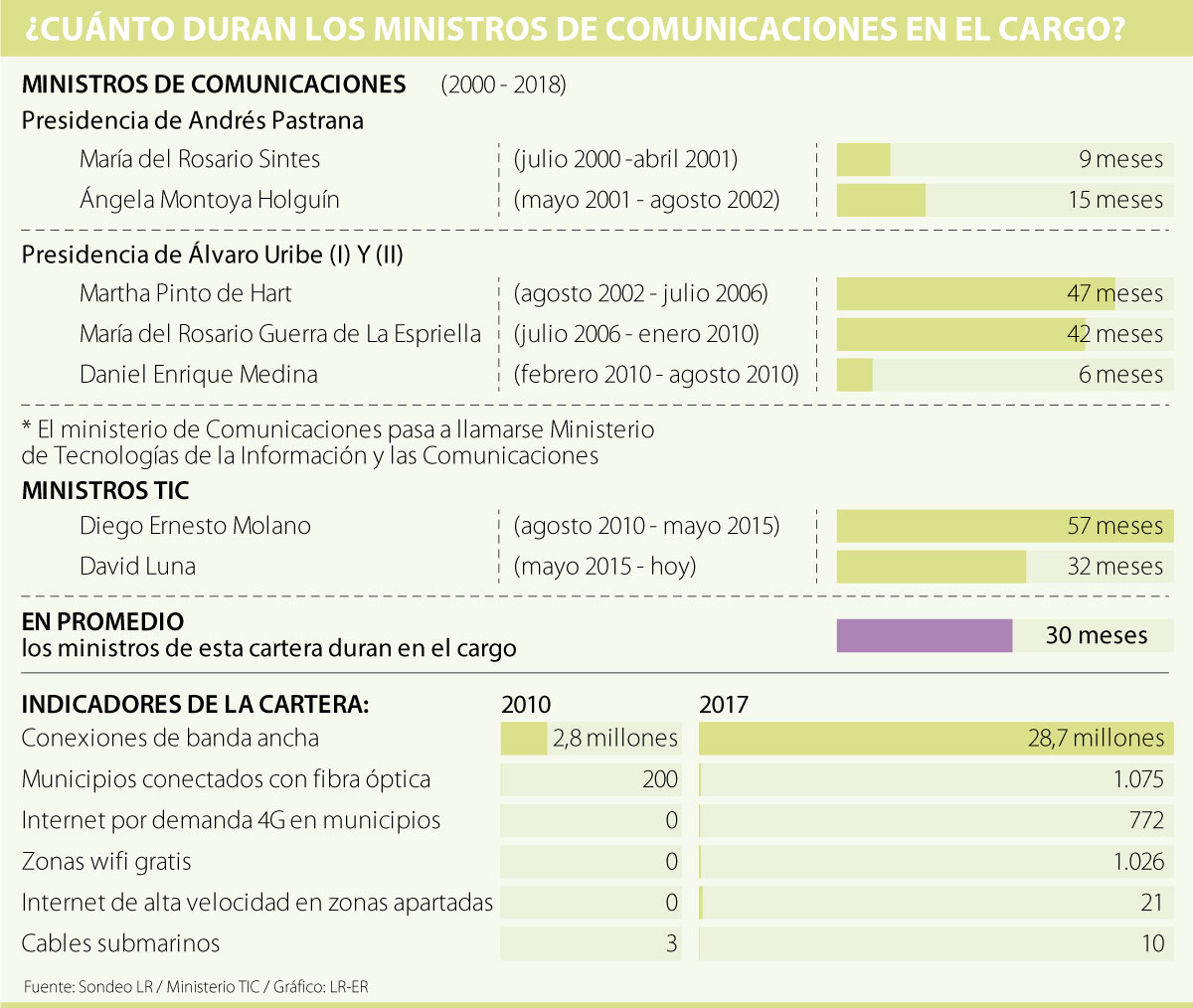 Si se ordenan los funcionarios que han ocupado el cargo durante más tiempo desde el 2000, Diego Molano se lleva el primer lugar, pues estuvo 57 meses como jefe de cartera y asumió el Ministerio cuando dejó de ser solo de comunicaciones para incluir también las tecnologías de la información. Martha Pinto de Hart, con 47 meses en el puesto, ocupa el segundo lugar, y María del Rosario Guerra, el tercero, con 42 meses.