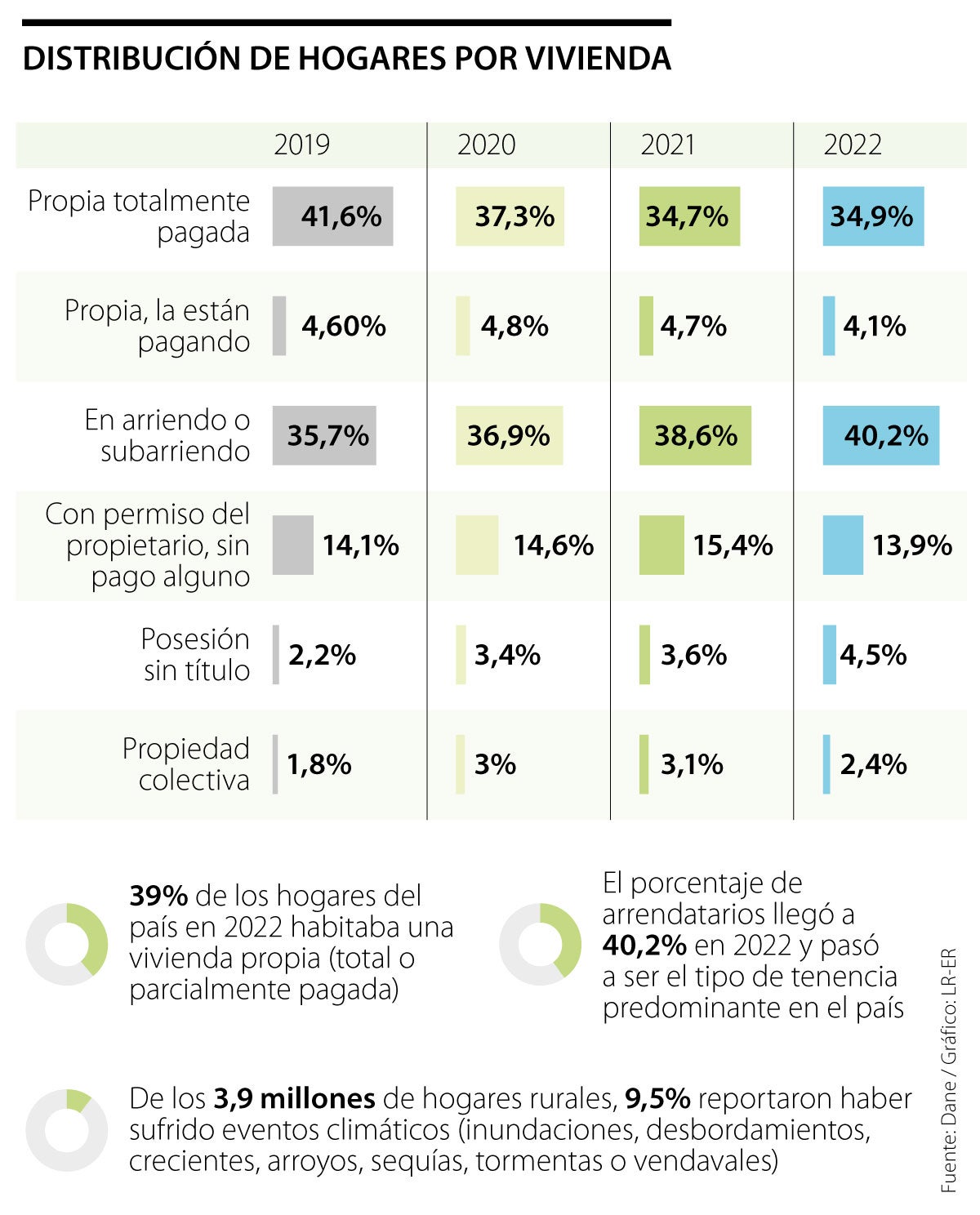 Entre los hallazgos de la encuesta del Dane, también se encontró que 13,9% de los hogares son usufructuarios, es decir, viven en casas con permiso del propietario, sin pago alguno; mientras que 4,5% son ocupantes de hecho, es decir, no poseen ningún título; y 2,4% viven en propiedades colectivas.