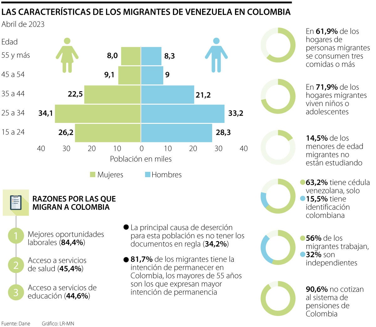 El Dane dio a conocer los resultados de la quinta ronda Pulso de la Migración. Esta se realizó con el apoyo del Banco Mundial y la Universidad del Rosario, y en ella se detallan las características de la población migrante venezolana en Colombia. En esta se hace énfasis en las barreras de acceso al mercado laboral. Se destaca que ocho de cada 10 migrantes tiene la intención de permanecer en el país. La intención aumenta por rango de edad, pues son los mayores de 55 años los que más manifiestan la intención de permanencia (87,4%).