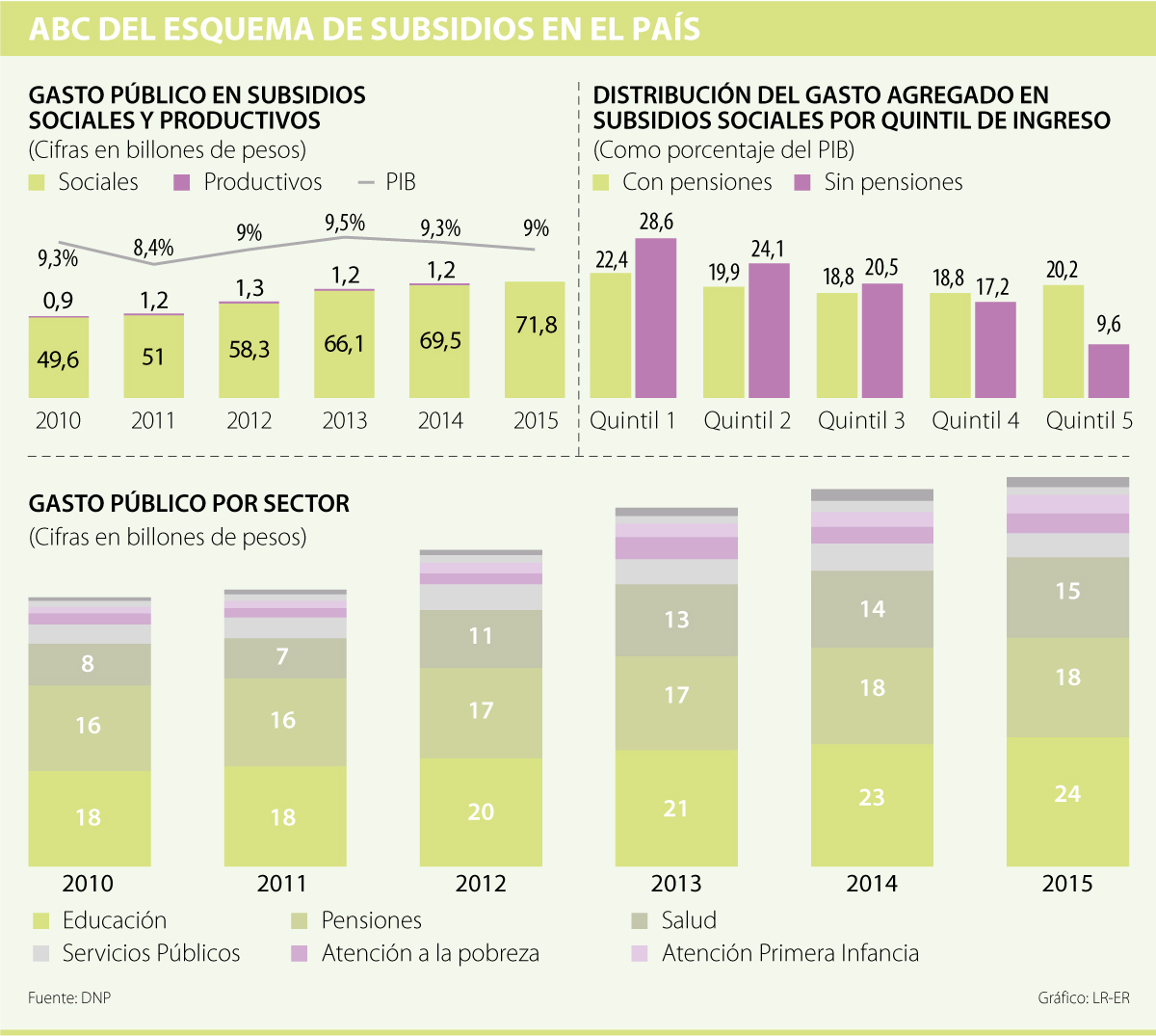 En Colombia, el gasto de los subsidios sociales (el que se concede a los individuos y los hogares) y los productivos (para las empresas) es elevado. A 2015, según los últimos cálculos del Departamento Nacional de Planeación (DNP), el gasto anual en los primeros fue de $71,8 billones, lo que representa 9,0% del PIB, siendo los más representativos los de educación (33% del total promedio), los de pensiones (28%), los de salud (18%) y los servicios públicos (7%). Por su parte, los de las empresas solo representan unos $1,2 billones, es decir, 0,2% del PIB.