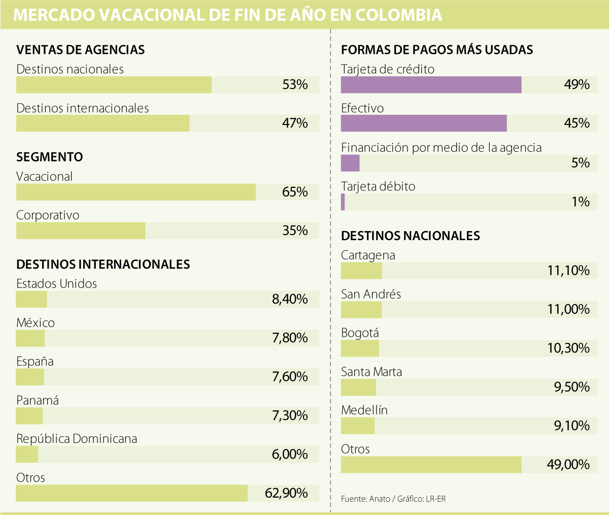 Cuatro veces al año, la Asociación Colombiana de Agencias de Viaje y Turismo (Anato) publica la encuesta que realiza a los operadores y agencias en las principales temporadas vacacionales del año (Semana Santa, mitad de año, Semana de Receso y temporada de fin de año).