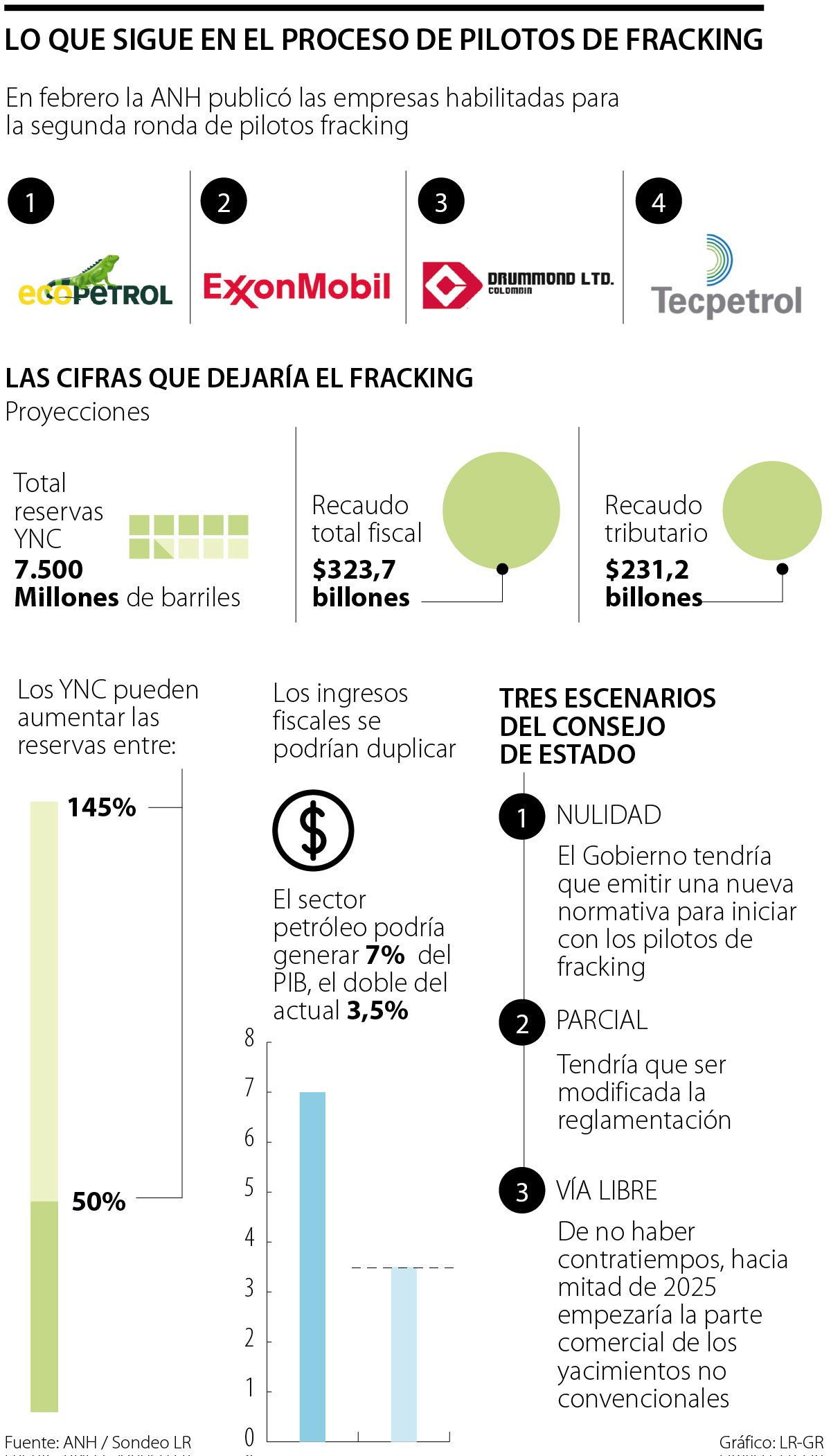 Estos pilotos se están adelantando por la ANH para analizar en varias zonas estos riesgos, que serán supervisados y, de hecho, el pasado 3 de febrero, la ANH publicó la lista de las empresas habilitadas para presentar propuestas, en las que están la argentina Tecpetrol, Ecopetrol, ExxonMobil y Drummond.