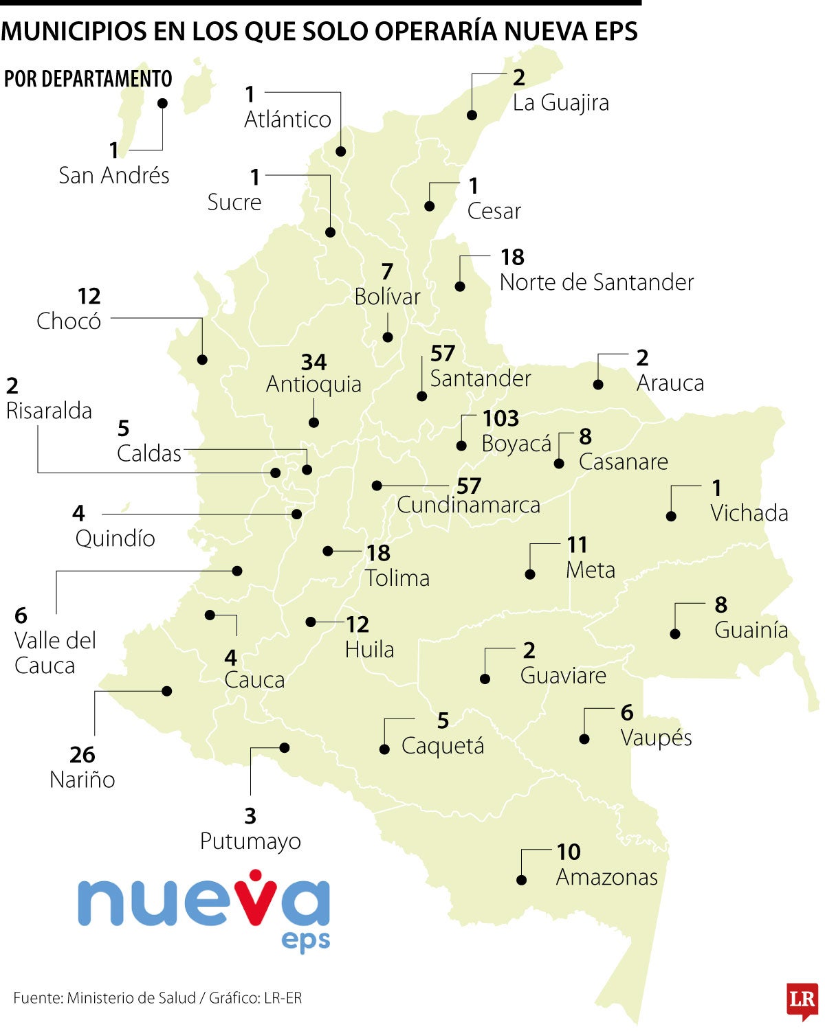También desaparecerían las entidades operadoras diferentes a la autorizada en 34 municipios de Antioquia, 26 de Nariño, 18 de Norte de Santander y 18 de Tolima. En todos estos territorios, los afiliados solo podrían ser atendidos por Nueva EPS.