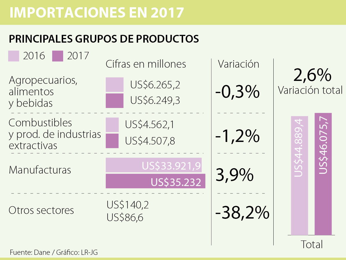Según la entidad, este comportamiento obedeció al crecimiento de 3,9% en las importaciones de manufacturas, al pasar de US$33.921,9 millones CIF en 2016 a US$35.232 millones CIF en 2017.