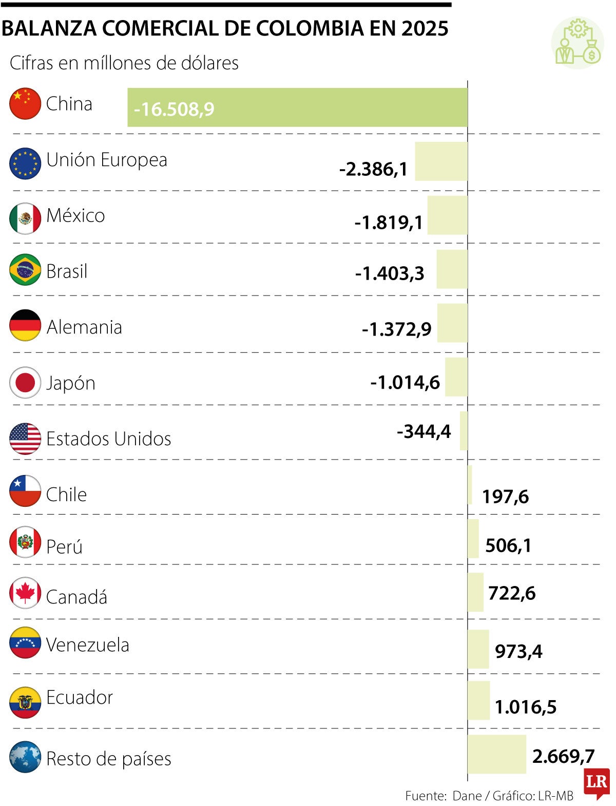 De acuerdo con los datos del Dane, el mayor déficit comercial del país se registra con China (US$16.508 millones); le siguen la Unión Europea (US$2.386 millones) y México (US$1.819 millones). En ese listado también aparecen Brasil (US$1.403 millones), Alemania (US$1.372 millones) y Japón (US$1.014 millones).