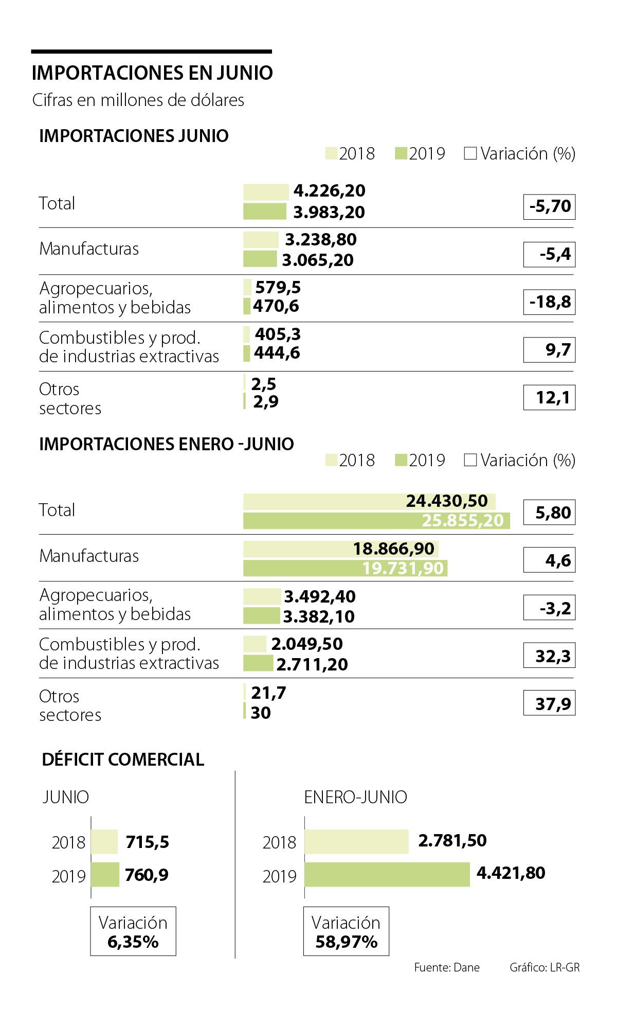 A pesar de que durante los primeros cinco meses de 2019 las importaciones aumentaron, la tendencia se detuvo en junio. Según el Dane, las compras al extranjero durante ese mes cayeron 5,7%, y registraron un valor de $3.983,2 millones.