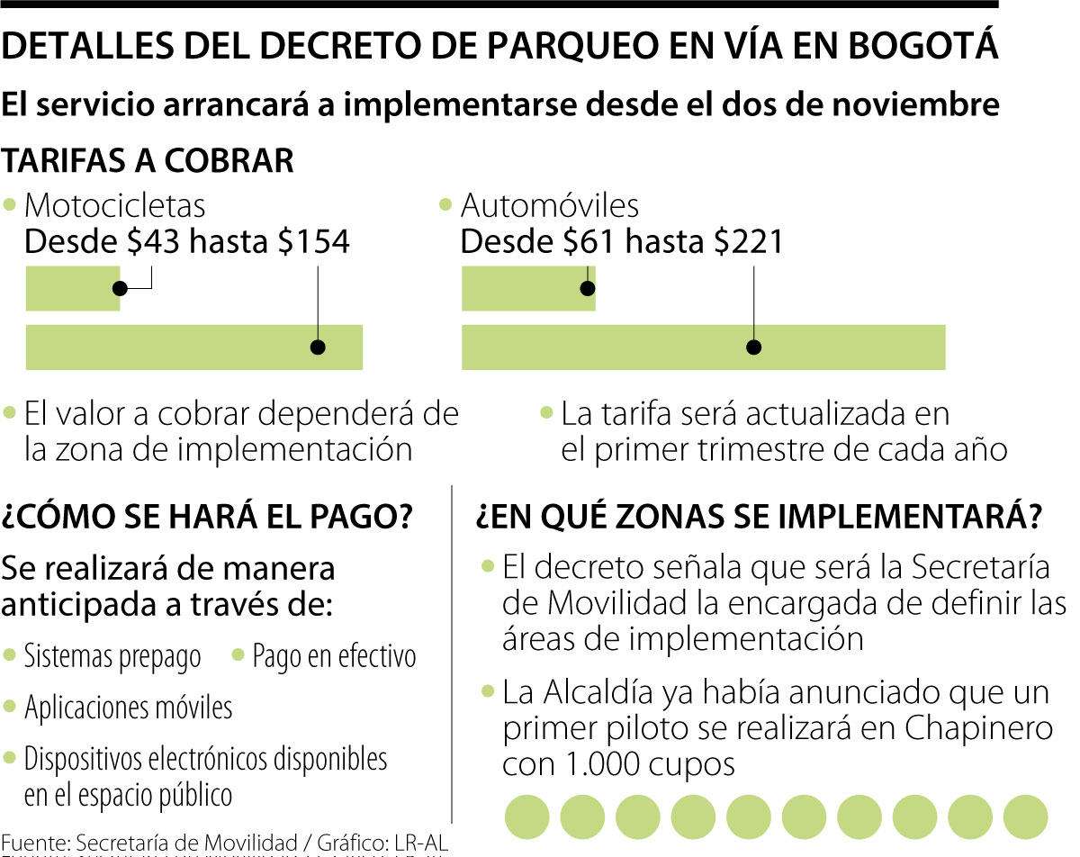 En cuanto a los horarios que serán permitidos, el decreto aclara que será la Secretaría Distrital de Movilidad la encargada de definir los horarios de operación de los segmentos viales para el estacionamiento, de acuerdo con las condiciones de operación de cada zona o área de implementación.