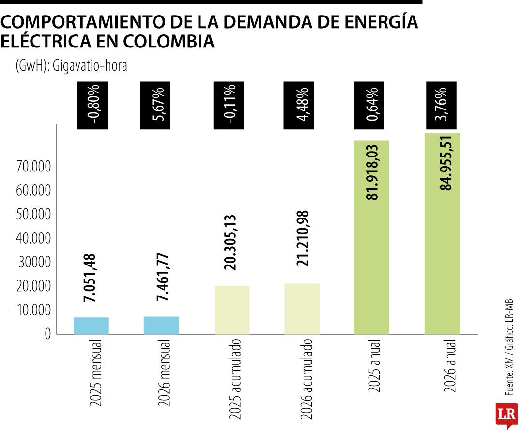 En lo corrido del año, la demanda de energía también registró un crecimiento, al pasar de 20.305,1 GWh entre enero y marzo de 2025 a 21.210,9 GWh en 2026