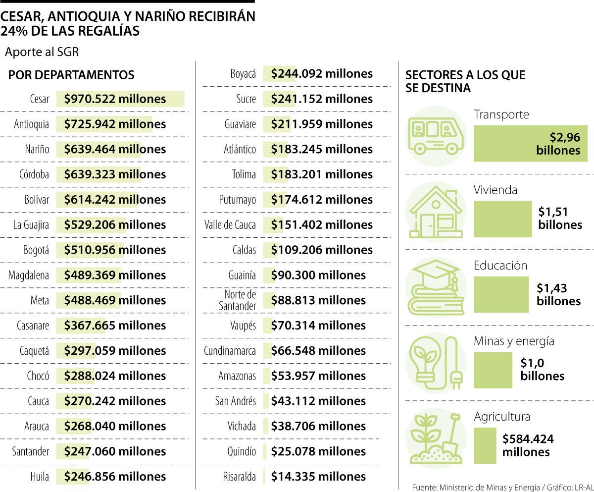 Por departamentos, Cesar fue el que más recursos recibió $970.522 millones durante el año. Es seguida por Antioquia con $725.942 millones y Nariño con $639.464 millones.