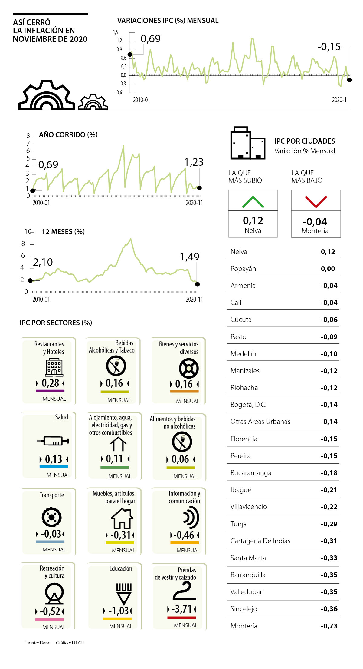 Por ciudades, la única que tuvo una variación positiva en el IPC fue Neiva con 0,12%, por el fin de la gratuidad en algunos servicios públicos de esa ciudad, mientras que la que más cayó fue Montería con -0,73%.
