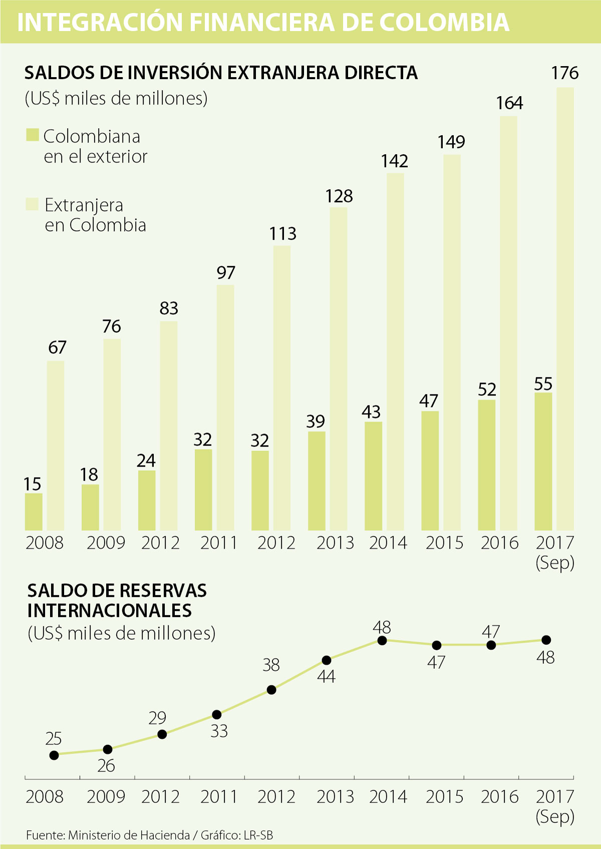 Además, según las estadísticas de Minhacienda, los papeles colombianos en manos de extranjeros se multiplicaron por 4,9 veces, de US$17.000 millones en 2008 a US$83.000 millones en 2017; por otro lado, los títulos extranjeros en manos de colombianos se multiplicaron por 2,9 veces, al pasar de US$15.000 a US$43.000 millones.