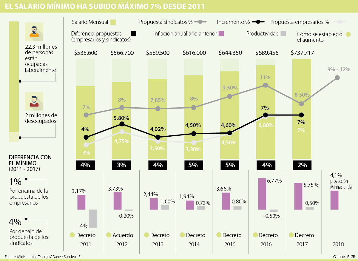 Mientras la discusión avanza, LR detalló las propuestas en los últimos siete años (2011-2017), así como el incremento del salario que se fijó y la inflación. La conclusión es que desde 2011, la definición del mínimo que se ha llevado a cabo en el Gobierno de Juan Manuel Santos ha estado más cerca de lo que han propuesto los gremios, que de la cifra de los sindicatos.