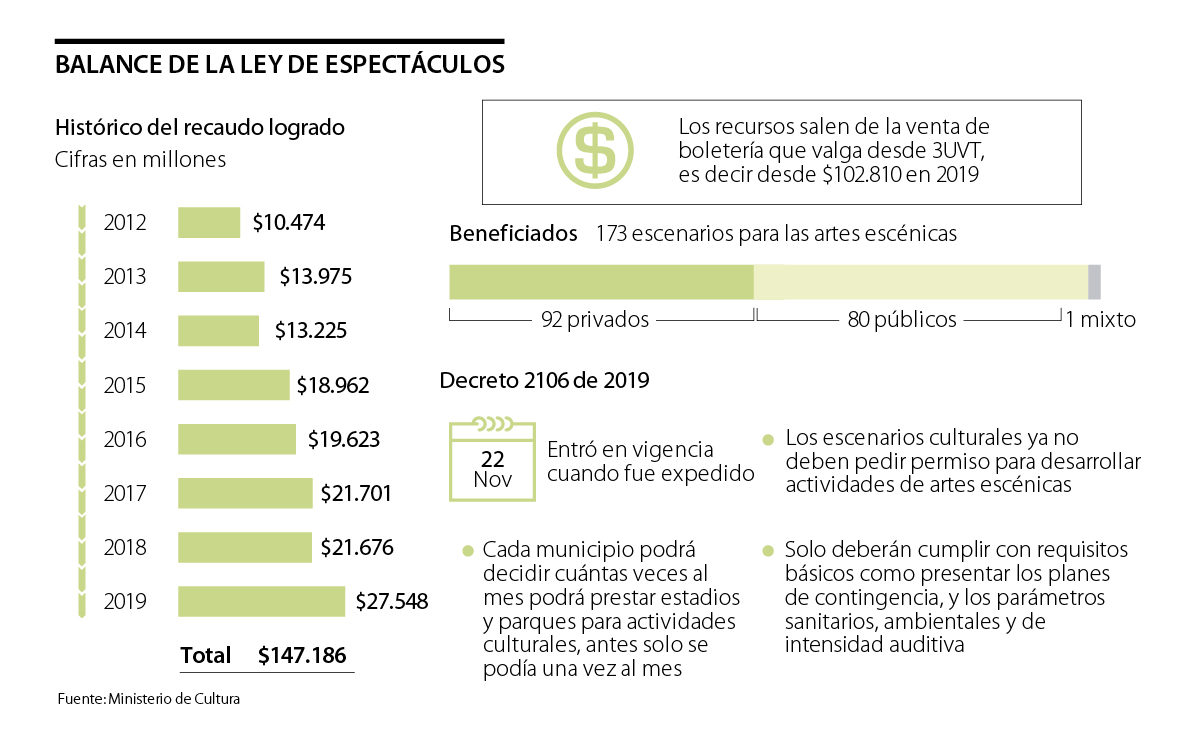 Desde la entrada en vigencia de la ley 1493 de 2011, conocida como la ley de espectáculos, que eliminó trámites y bajó la carga tributaria asociada a estas actividades, se han recaudado $147.186 millones. Los cuales, de acuerdo con el ministerio de Cultura, se han invertido en escenarios culturales, por lo que a la fecha se han beneficiado 173 escenarios para las artes escénicas, 92 privados, 80 públicos y uno de uso mixto.