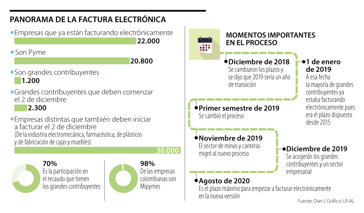 “Con una ley anterior, la 1819 de 2016, los grandes contribuyentes tenían que unirse el 1 de enero de 2019, pero estaban en una versión que se llamaba convalidación posterior, en la que enviaban la factura y se demoraba dos días. Y con la ley 1943 de 2018, este año empezamos a migrar a esa empresas a la versión dos, para que el método funcione de manera previa. Con ese cambio, todos los grandes contribuyentes y un sector de la industria tienen que empezar a facturar en la nueva versión este lunes”, señaló Mario Márquez, gerente del proyecto de factura electrónica de la Dian. Ese otro sector es el farmacéutico, electromecánico, de plásticos y las empresas dedicadas tanto a fabricar cajas como muebles.