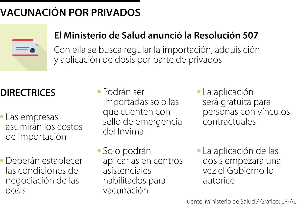 Un punto sumamente importante de la reglamentación es que solo podrán ser importadas las dosis que tengan sello de emergencia otorgado por el Instituto Nacional de Vigilancia de Medicamentos y Alimentos (Invima). Una vez las vacunas estén en poder de los privados, solo podrán aplicarlas en las entidades prestadoras de salud habilitadas para este servicio, el cual es otorgado por la Secretaría de Salud. Si la persona que aspira a la vacunación tiene algún nexo o vínculo contractual con el privado importador, podrá acceder a la aplicación de la dosis de forma gratuita.