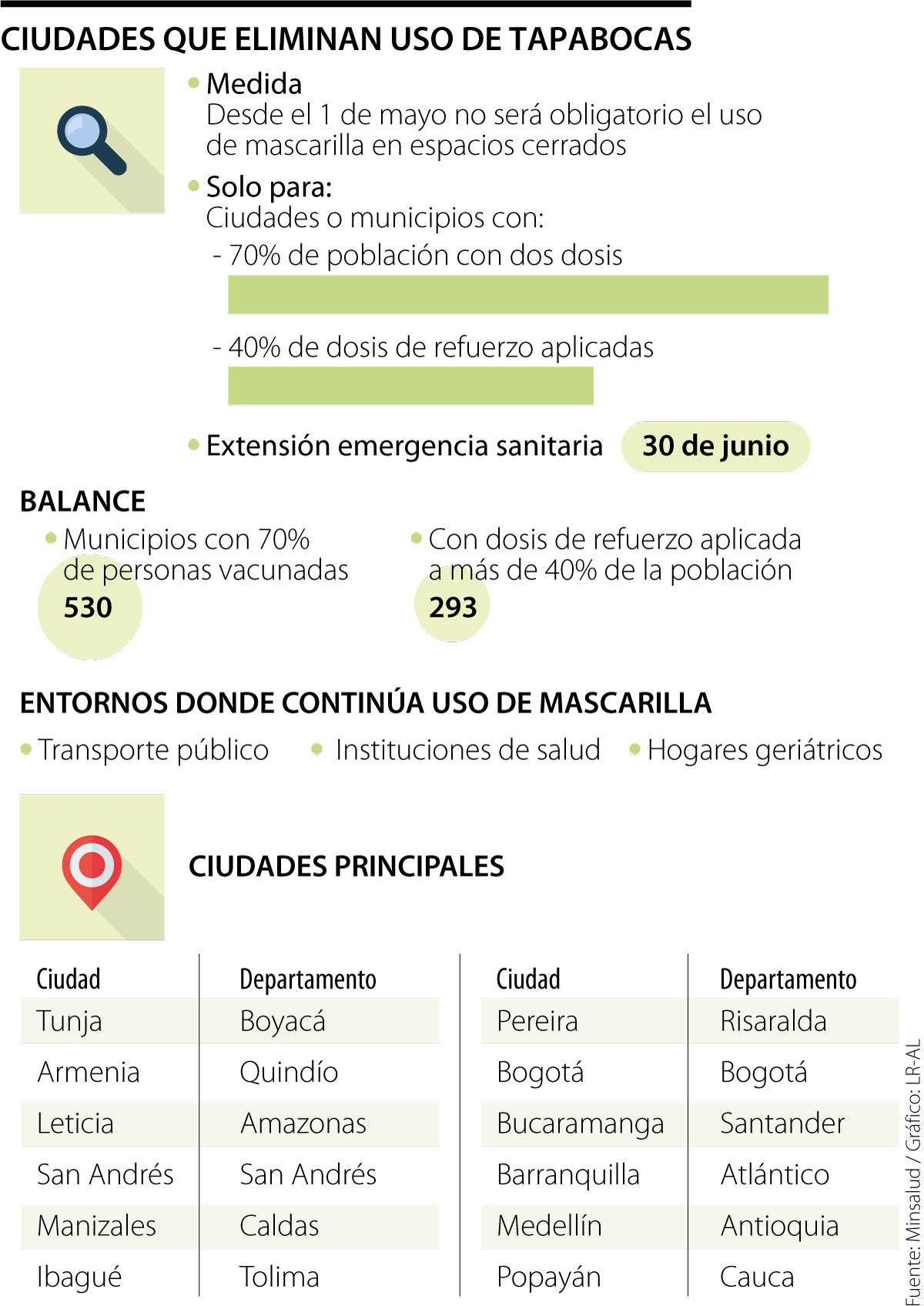 De acuerdo con las disposiciones del Ministerio de Salud, solo se retirará el uso del tapabocas en ciudades en las que 70% de su población tenga el esquema de vacunación completo y que 40% cuente con dosis de refuerzo, exceptuando al transporte público, los centros de salud y los geriátricos.