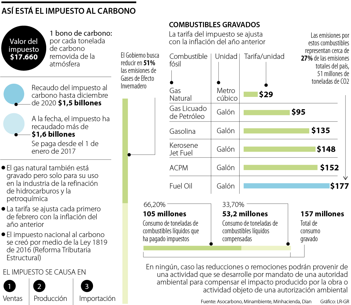 El postulado va en línea con lo indicado por Luis Hernández, investigador del Observatorio Ambiental de la Universidad de los Andes, quien dijo que el impuesto al carbono es una buena iniciativa cuya finalidad es estimular la reducción de CO2 al aplicarse sobre combustible fósiles.