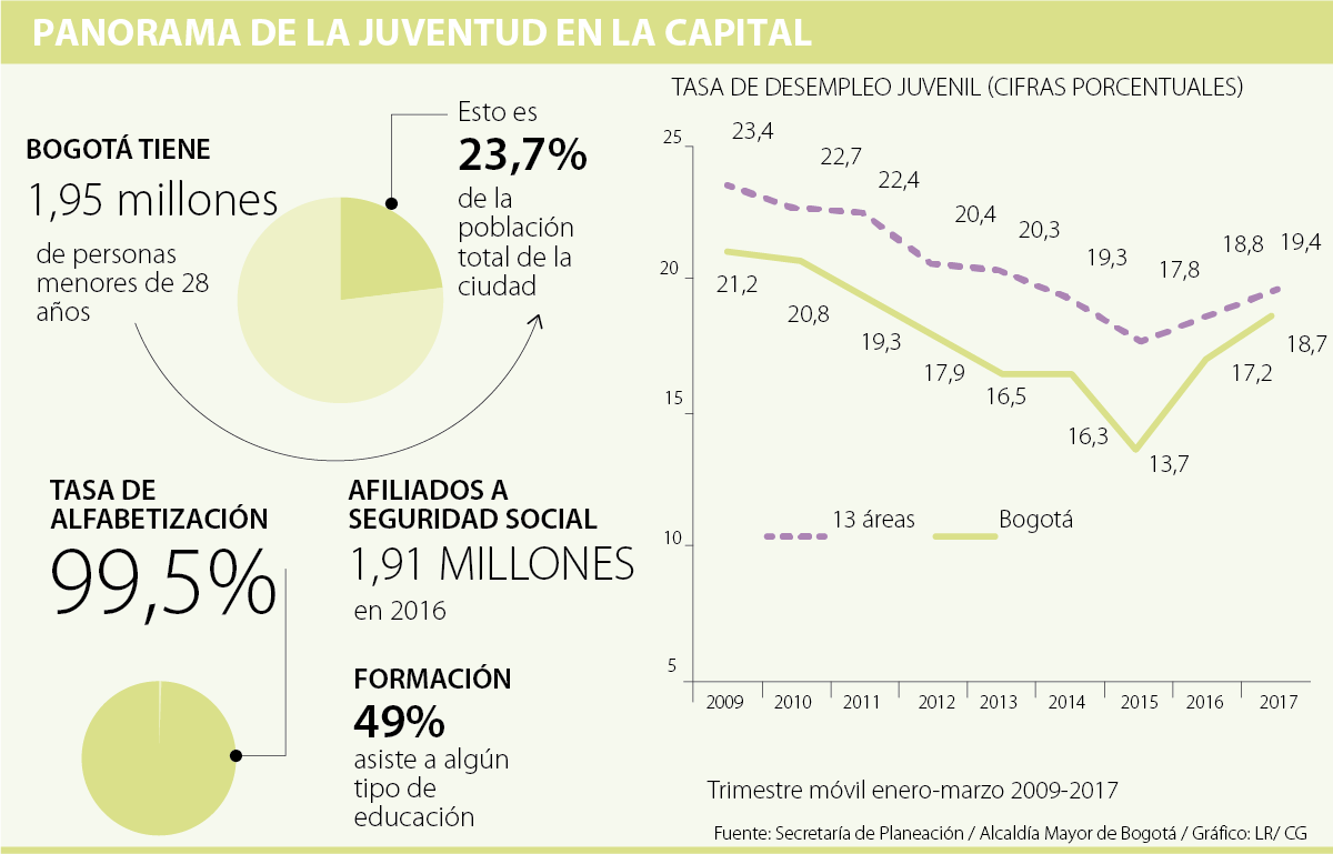 Un informe de la Secretaría Distrital de Planeación destacó que el desempleo juvenil en Bogotá fue de 18,7% entre enero y marzo, según el Departamento Administrativo Nacional de Estadística (Dane), el doble de la tasa para el total nacional que permanece por debajo de la meta de dos dígitos.
