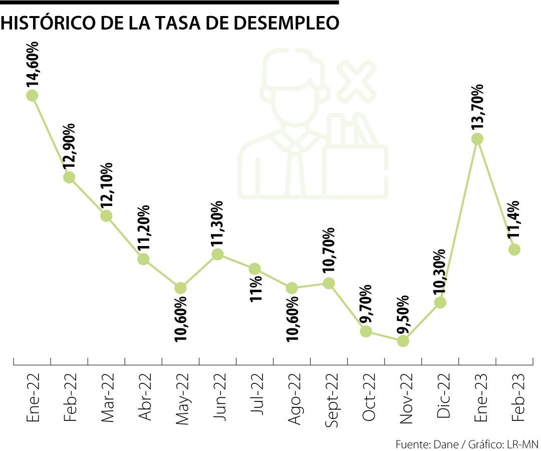 En febrero hubo 2,8 millones de personas desempleadas, lo que quiere decir que cerca de 365.000 salieron de esta situación. Esas son las cifras que reportó el Dane para el segundo mes de este año, en el que se registró una tasa de desempleo de 11,4%, menor en 1,5 puntos porcentuales a la que se reportó en febrero de 2022.