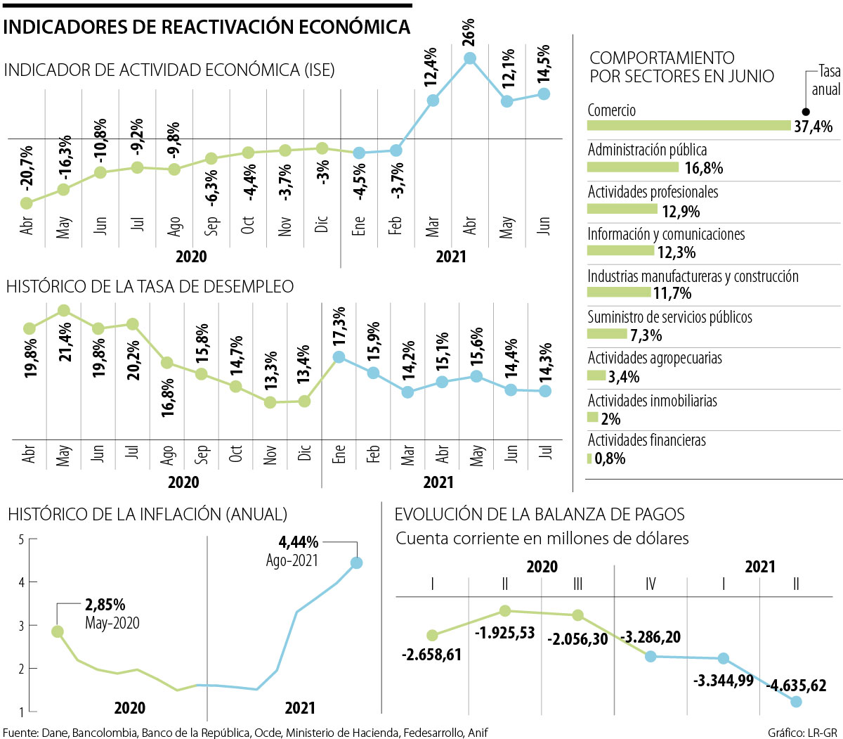 En agosto el IPC cerró en 4,44%, la cifra más alta de los últimos cinco años. Entre tanto, se espera que en los próximos meses el PIB no registre alzas como la del segundo trimestre, dado que empieza a haber una normalización en la base de comparación frente 2020.