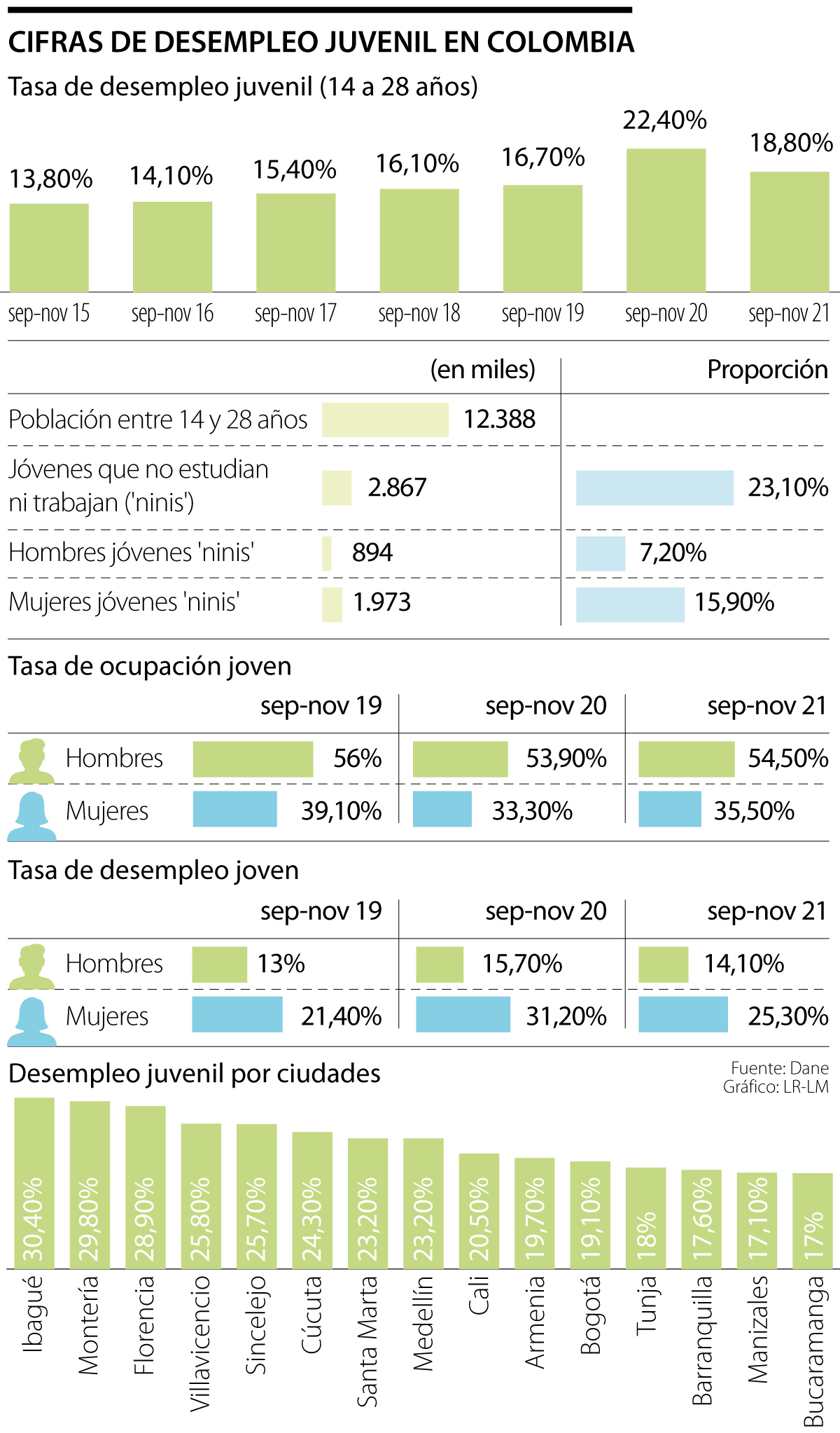 El Departamento Administrativo Nacional de Estadística (Dane) reveló que en el trimestre de septiembre a noviembre del año pasado la tasa de desempleo juvenil, que comprende a la población entre 14 y 28 años, cayó 3,6 puntos porcentuales y se ubicó en 18,8%.