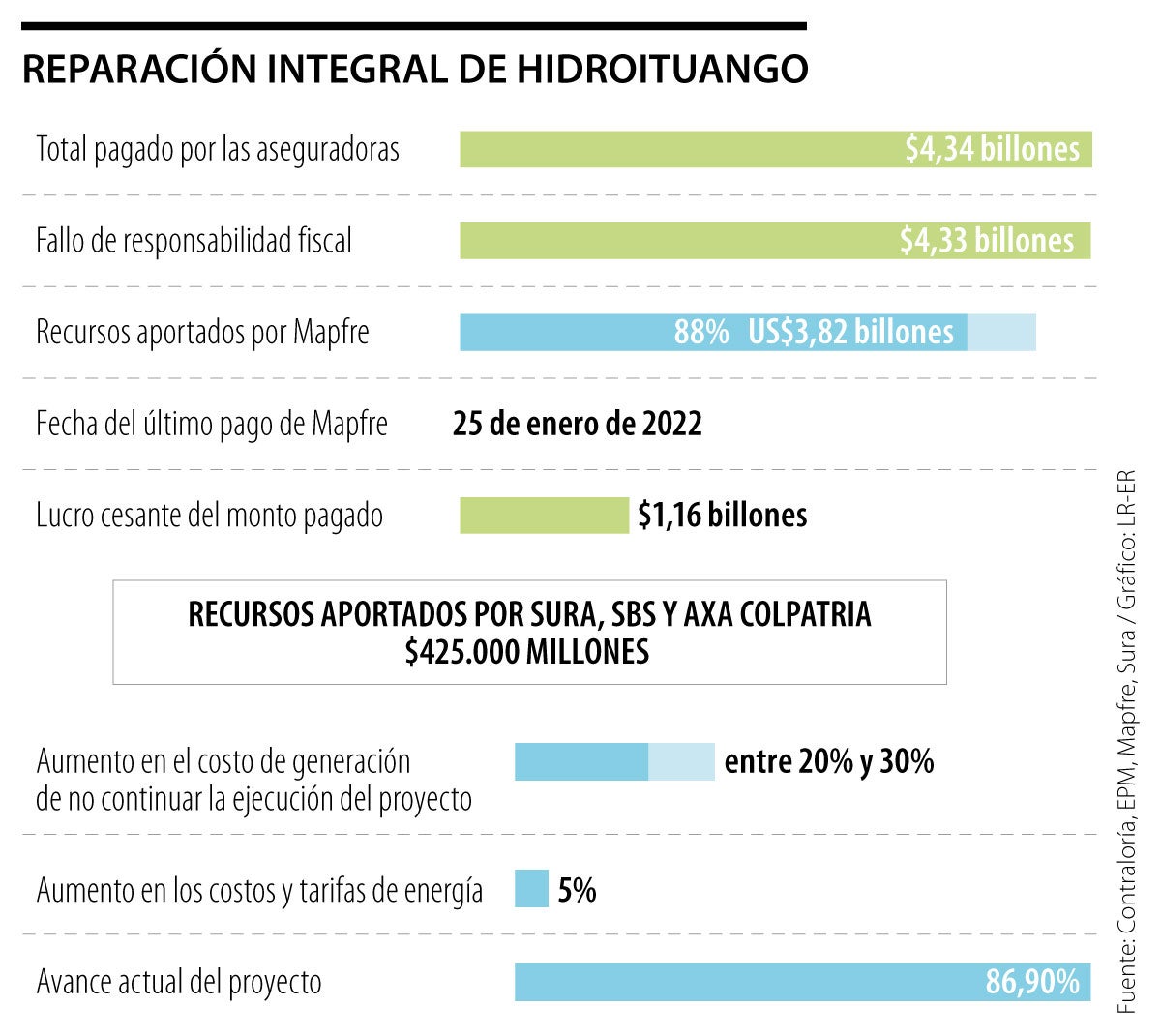 En este sentido, la aseguradora Mapfre realizó el último pago el pasado martes 25 de enero de 2022, por la suma de US$633,8 millones. Ya había realizado un adelanto de US$350 millones a EPM, con ocasión de los pagos hechos a partir de la contingencia; así, se completaron US$983 millones de la indemnización bajo la Póliza Todo Riesgo Construcción.