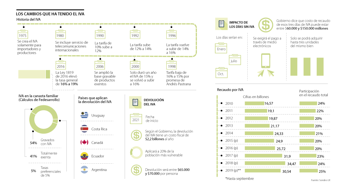 El IVA es un impuesto que ha estado presente desde hace 44 años. Su ajuste más reciente fue en la tributaria de 2016 cuando la tarifa general se elevó de 16% a 19%. El año pasado, dejó $34,5 billones, 24% del recaudo total. “Las medidas serían un recorte de un par de billones, que estaría ofreciendo el Presidente para que el Congreso le apruebe una reducción de $9 billones que benefician a las empresas”, dijo Luis Reyes, director del Observatorio Fiscal de la Universidad Javeriana.