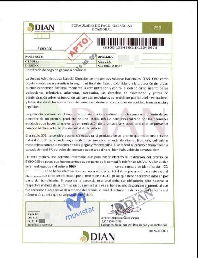 Estafadores estarían enviando mensajes y correos electrónicos haciéndose pasar por la Dirección de Impuestos y Aduanas Nacionales (Dian). En ellos, estarían afirmado a las víctimas que habrían ganado alguna rifa o premio para cuya redención sería necesario pagar el impuesto sobre la ganancia ocasional derivada de este.