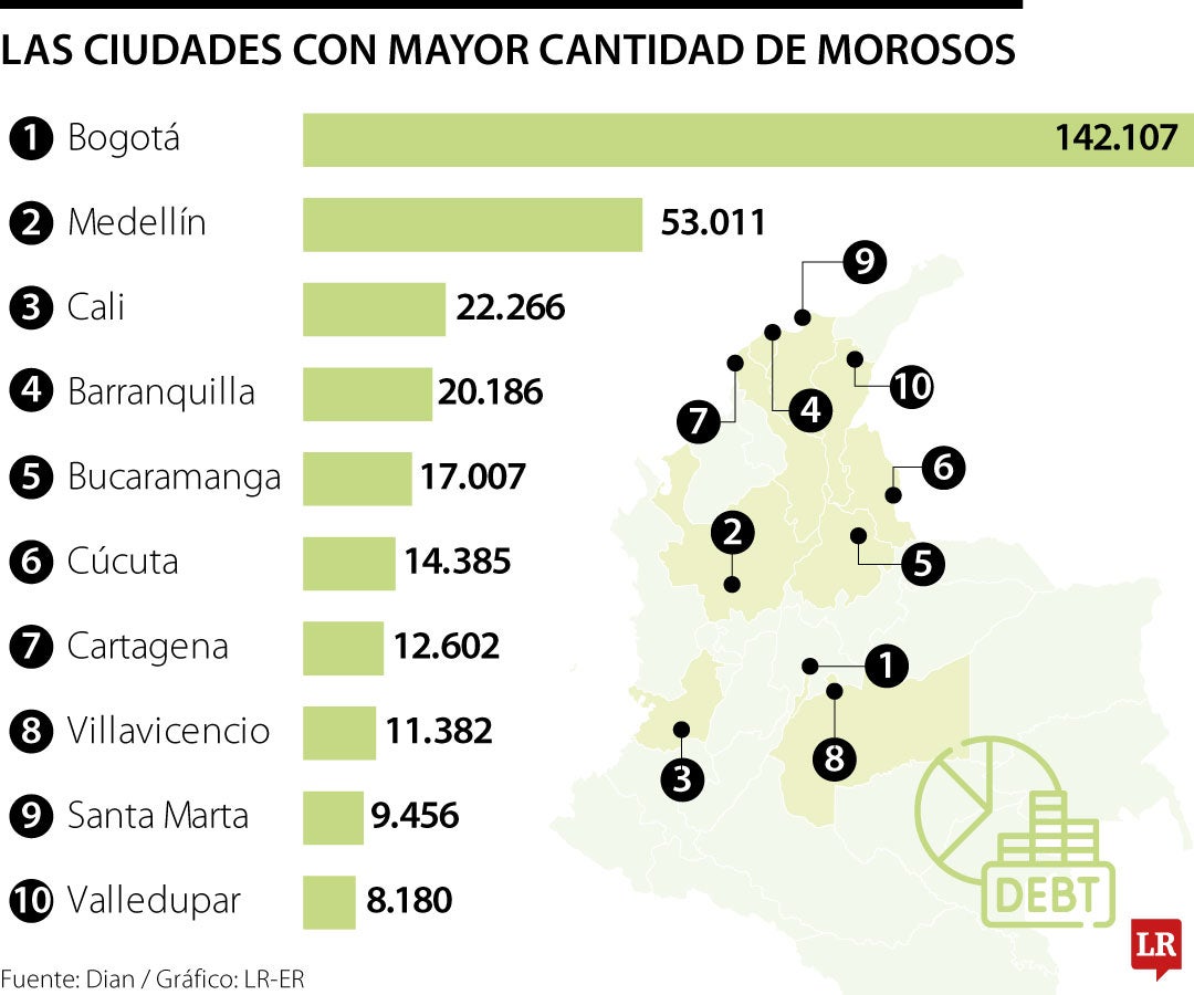 Las ciudades con mayor concentración de morosos se registran principalmente en Bogotá (142.107), Medellín (53.011), Cali (22.266) y Barranquilla (20.186). También figuran otras capitales como Bucaramanga (17.007), Cúcuta (14.385), Cartagena (12.602), Villavicencio (11.382), Santa Marta (9.456) y Valledupar (8.180).