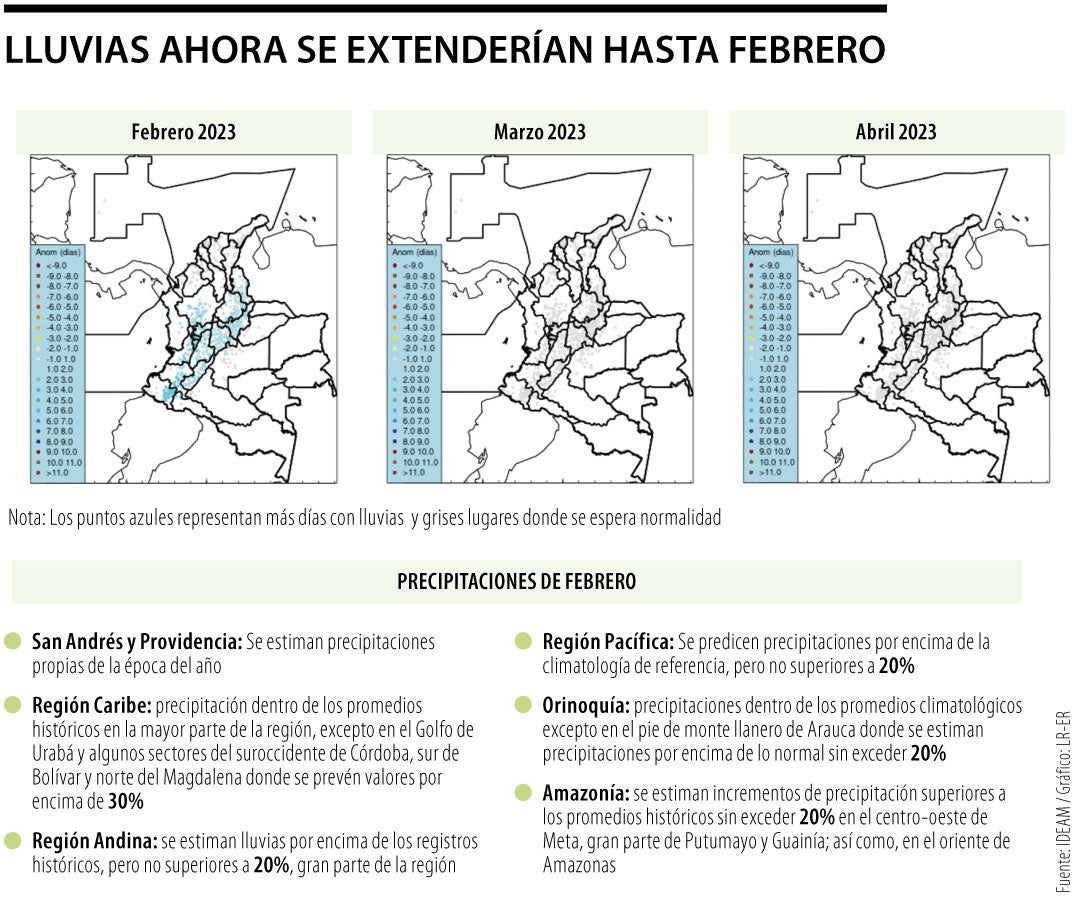 Franklin Ruiz, profesional de la subdirección de meteorología del Ideam, explicó que “cuando decimos que las precipitaciones o que el número de días va a estar por encima de los primeros promedios climatológicos, se esperan más días de lluvias con respecto a esos valores, las del pronóstico de 2023 por ejemplo, y para el caso de febrero está estimando que esa anomalía podría oscilar entre uno o tres o tres días más dependiendo de la región, básicamente lo que quiere decir la predicción es que las lluvias estarán por encima de la normal y con un número de días húmedos mucho mayor”.