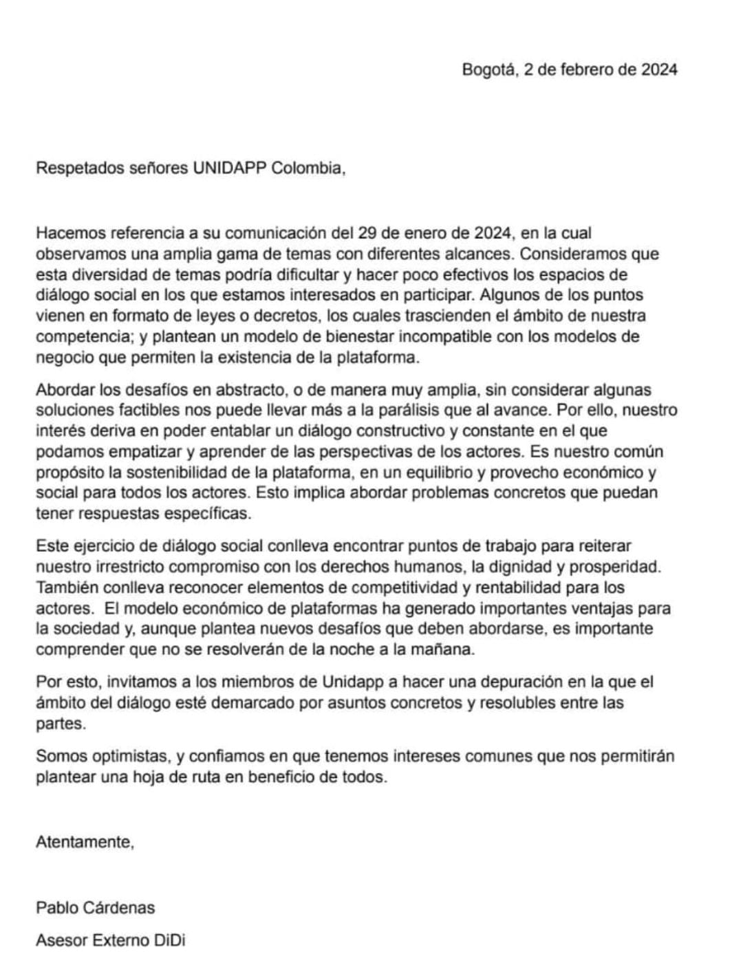 Pablo Cárdenas, asesor externo de la empresa, aseguró que algunos de los puntos vienen en formato de leyes o decretos, "los cuales trascienden el ámbito de nuestra competencia; y plantean un modelo de bienestar incompatible con los modelos de negocio que permiten la existencia de la plataforma".