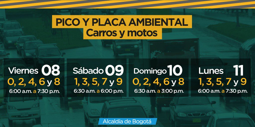 Para el fin de semana, la Secretaría de Movilidad estableció que los vehículos impares no podrán circular por la capital el sábado entre las 6:30 am y las 6:00 pm. Así mismo, el domingo la restricción aplicará para los vehículos pares de 6:30 am a 3:00 pm.